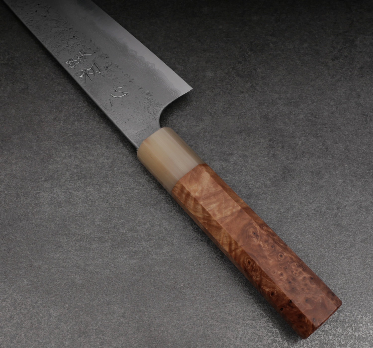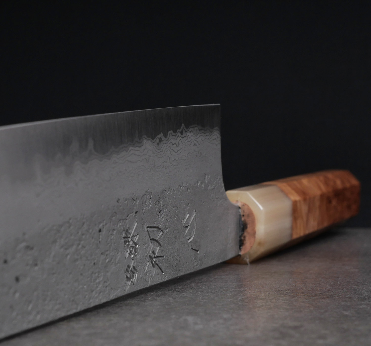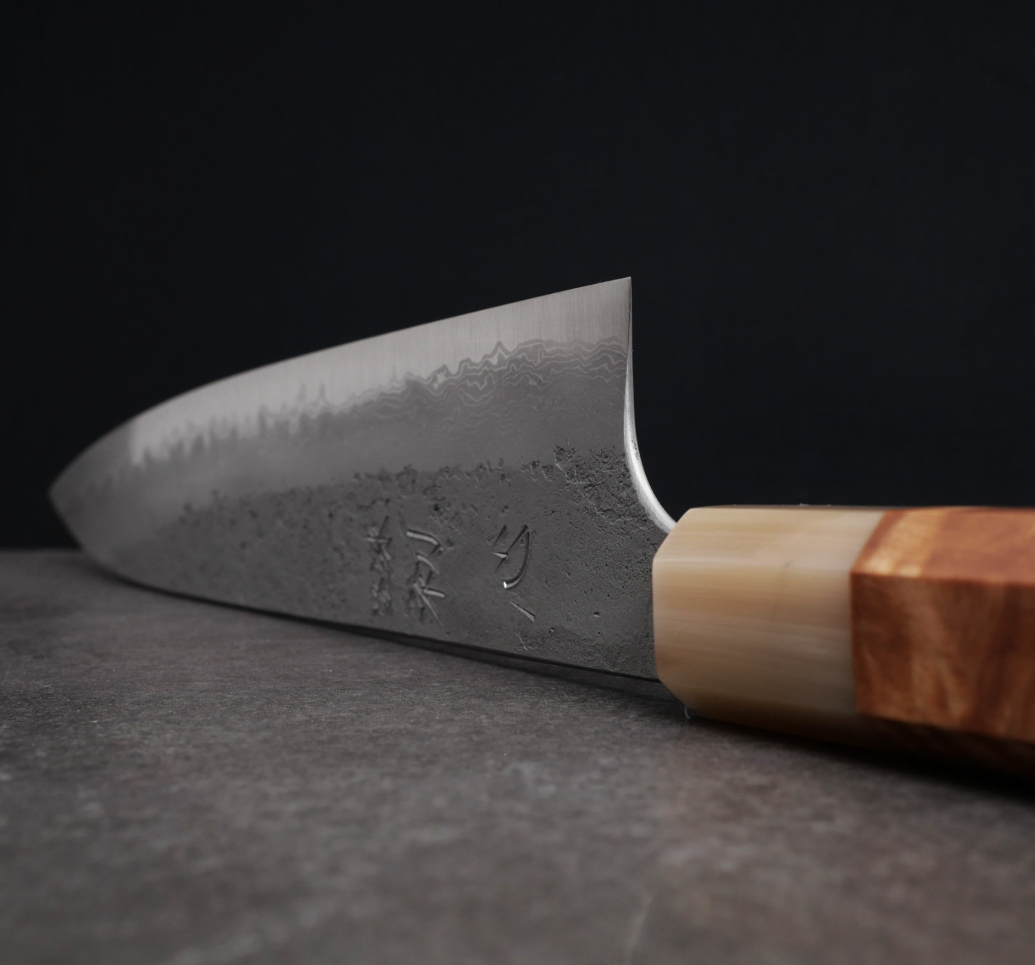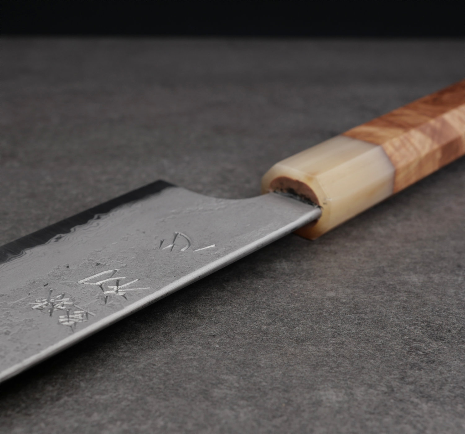Kärnstål: Aogami #2 (Blue #2). Kolstål med hög skärpa och utmärkt skärpevarighet