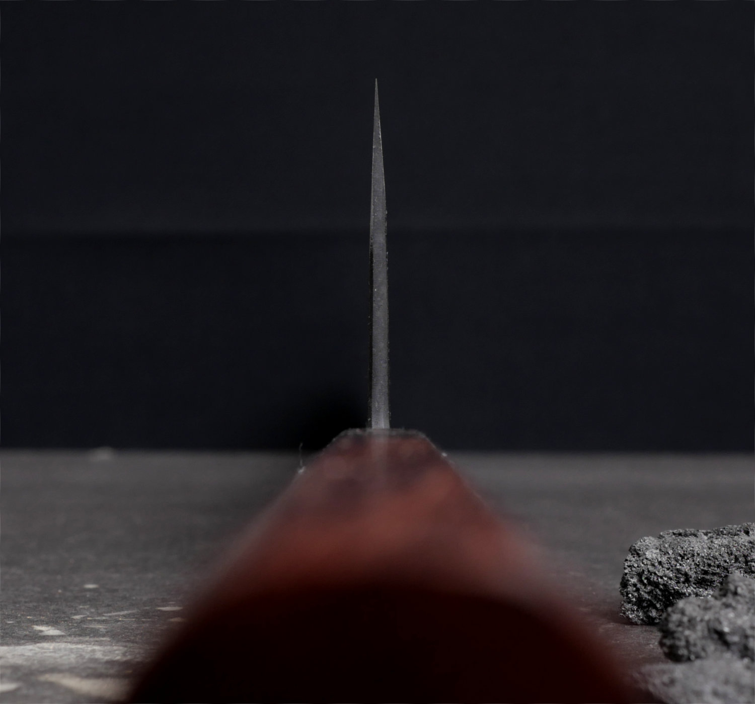 Sakimaru gyuto, kockkniv med rundad spets, med ett blad som mäter 265 mm och ett oktagonalt skaft i renghas. Själva skäreggen mäter 245 mm.