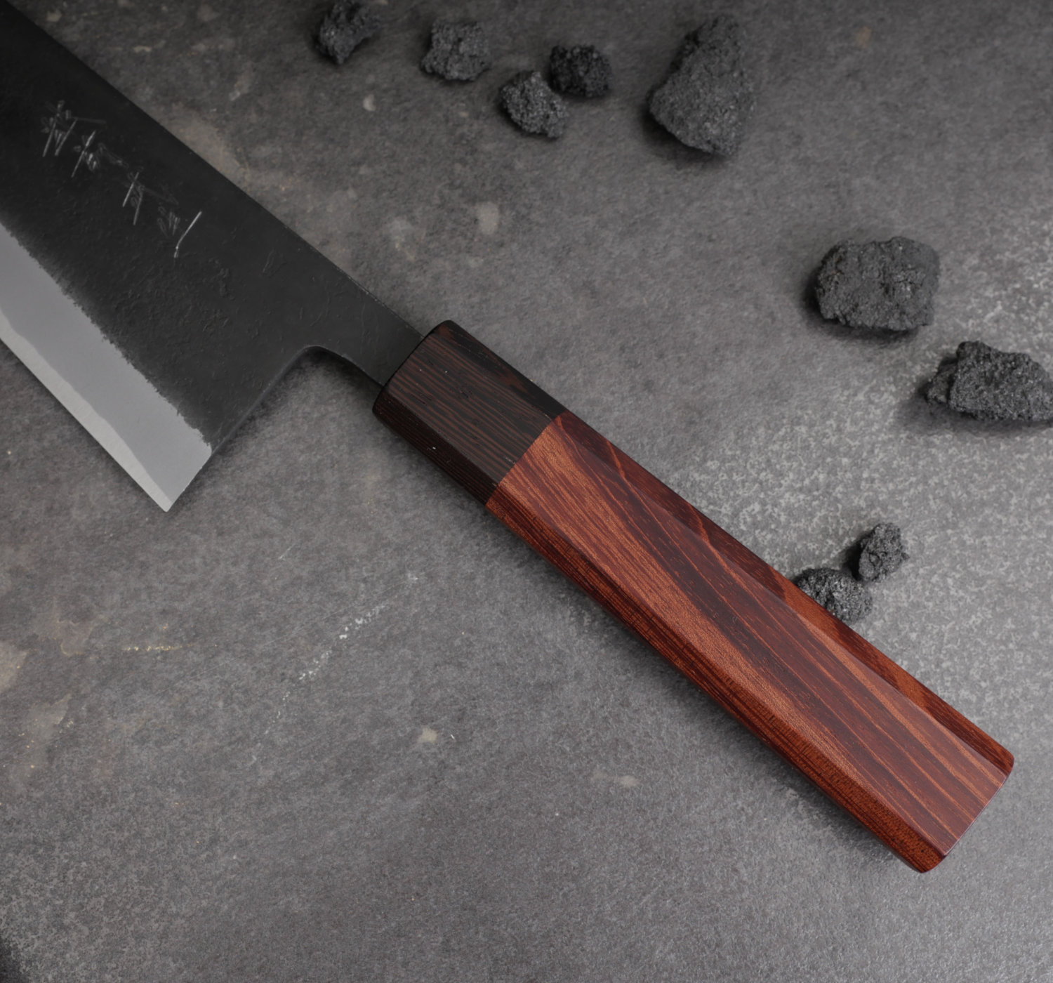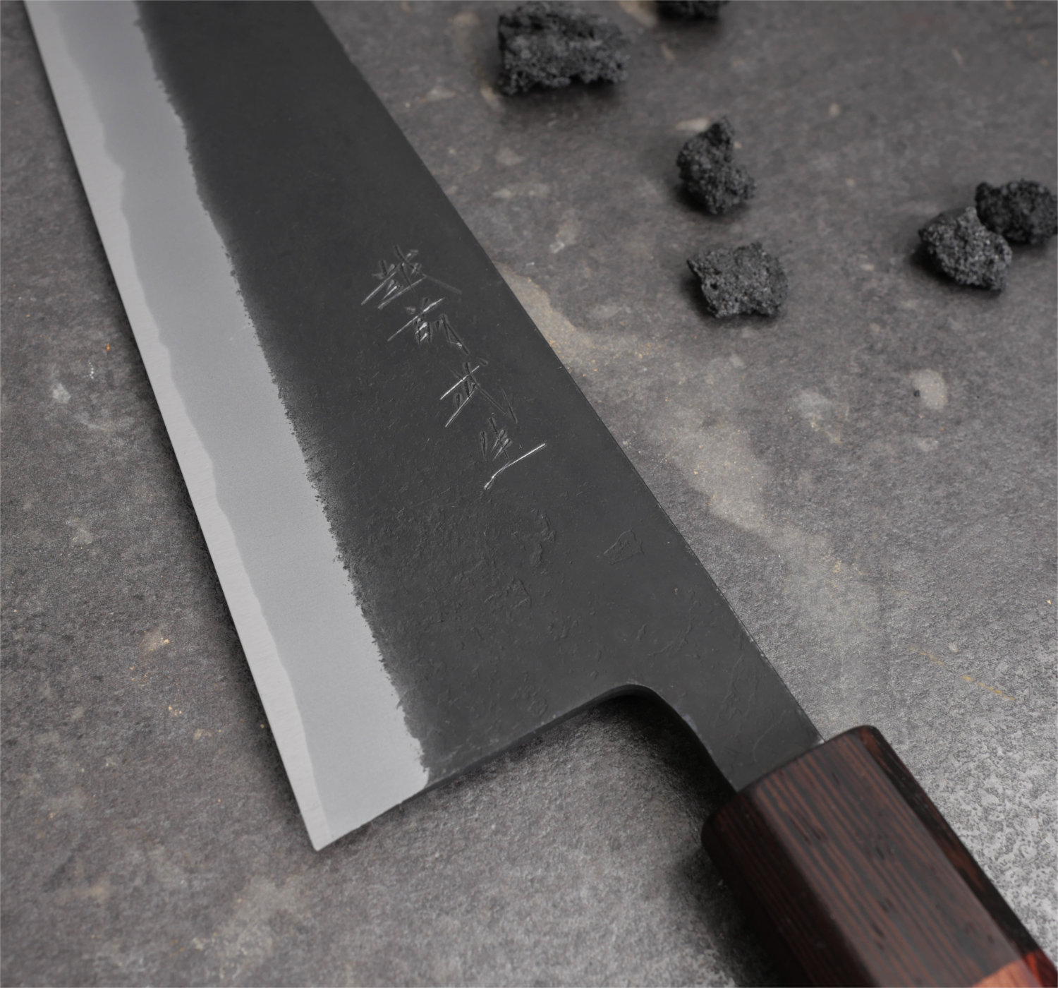 Shiro Kamo 'Kazan' är ett handsmitt precisionsinstrument från ett av de största namnen i Takefu, Japan. Shiro Kamo smider fram tunna och fina klingor med väl avvägd tapering och fin balans. Den tunna eggen i kolstålet shirogami#2 tar en våldsamt skarp egg och den höga kolhalten gör kniven lätt att både bryna och slipa. Runt kärnstålet ligger ett lager mjukt järn på vardera sida. Denna kappa har försetts med svartoxiderad kurouchi och en lätt nashijifinish. Nashiji betyder päronskal på japanska och det är ett sätt att förse bladsidan med en småskrovlig och rå yta. Skaftet är oktagonalt med renghas trä.