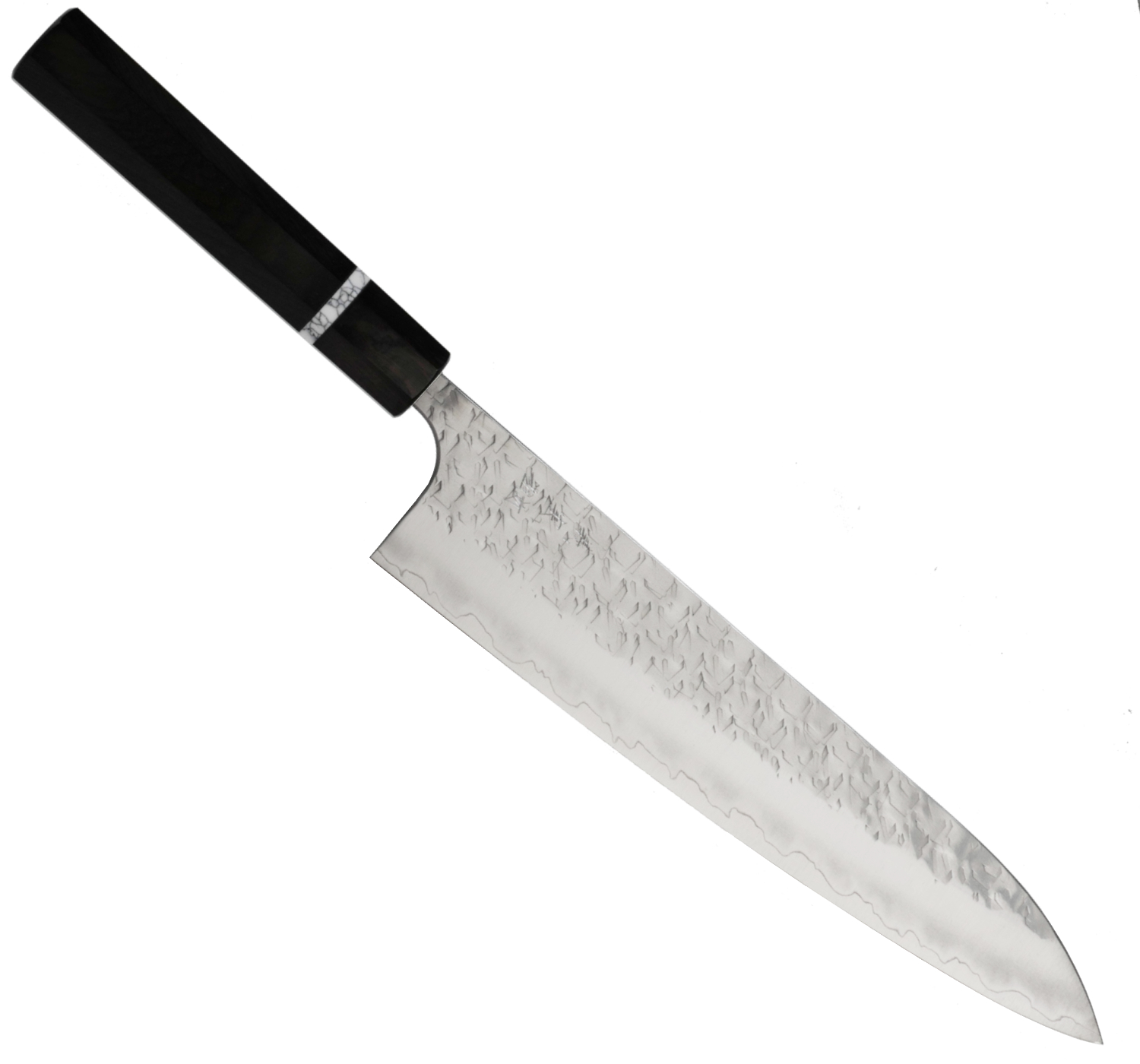 Knivarna i denna serie är smidda i det rostfria pulverstålet SG2, ett finkornigt stål som tar en mycket vass egg och som tål riktigt låga vinklar. Knivar i den här stilen beskrivs ofta som en "laser" där skäregenskapper imponerar, särskilt när du skivar tjockare råvaror som morot och potatis. Bladsidorna pryds av ett unikt hamrat mönster som därefter polerats till spegelfinish för både skönhet och optimal släppförmåga.