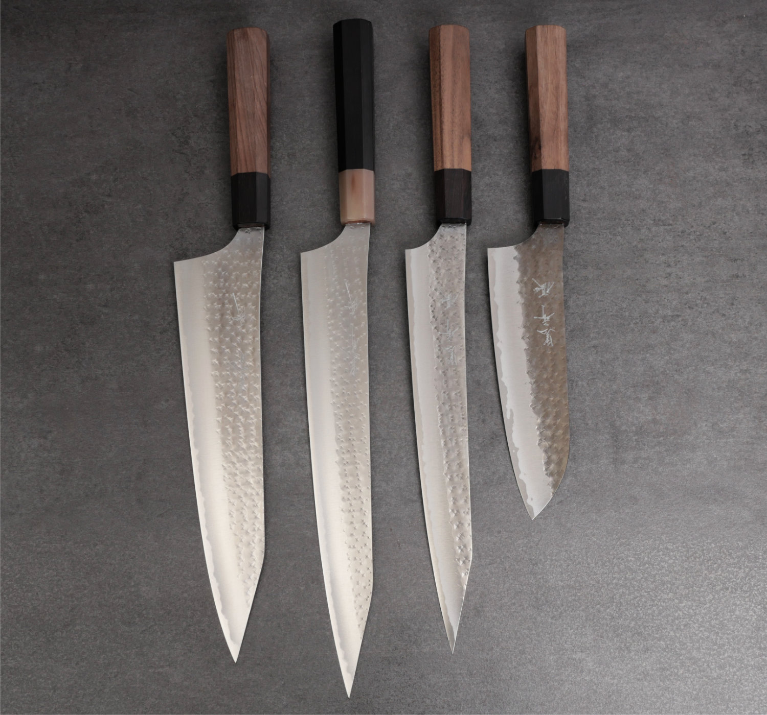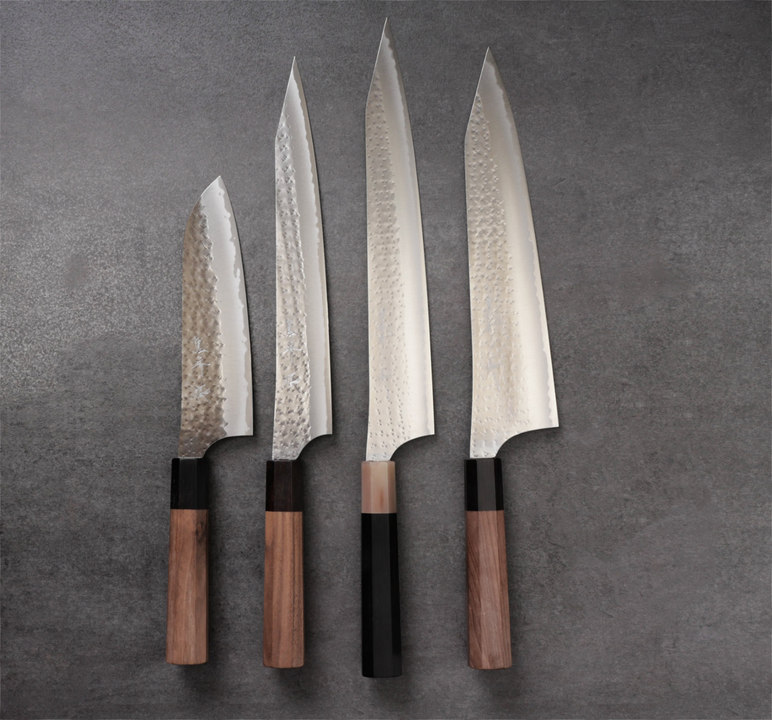 Yu Kurosaki 'Kokusen'. Kurosaki knivar är bedårande vackra. Formgivningen är kreativ och materialvalen håller alltid toppklass. I denna serie kombinerar han det toppresterande kolstålet aogami super med hammarbankade bladsidor som svärtas och poleras. Bladen är mycket tunna och håller skärpan exeptionellt länge tack vare det hårda kolstålet aogami super.