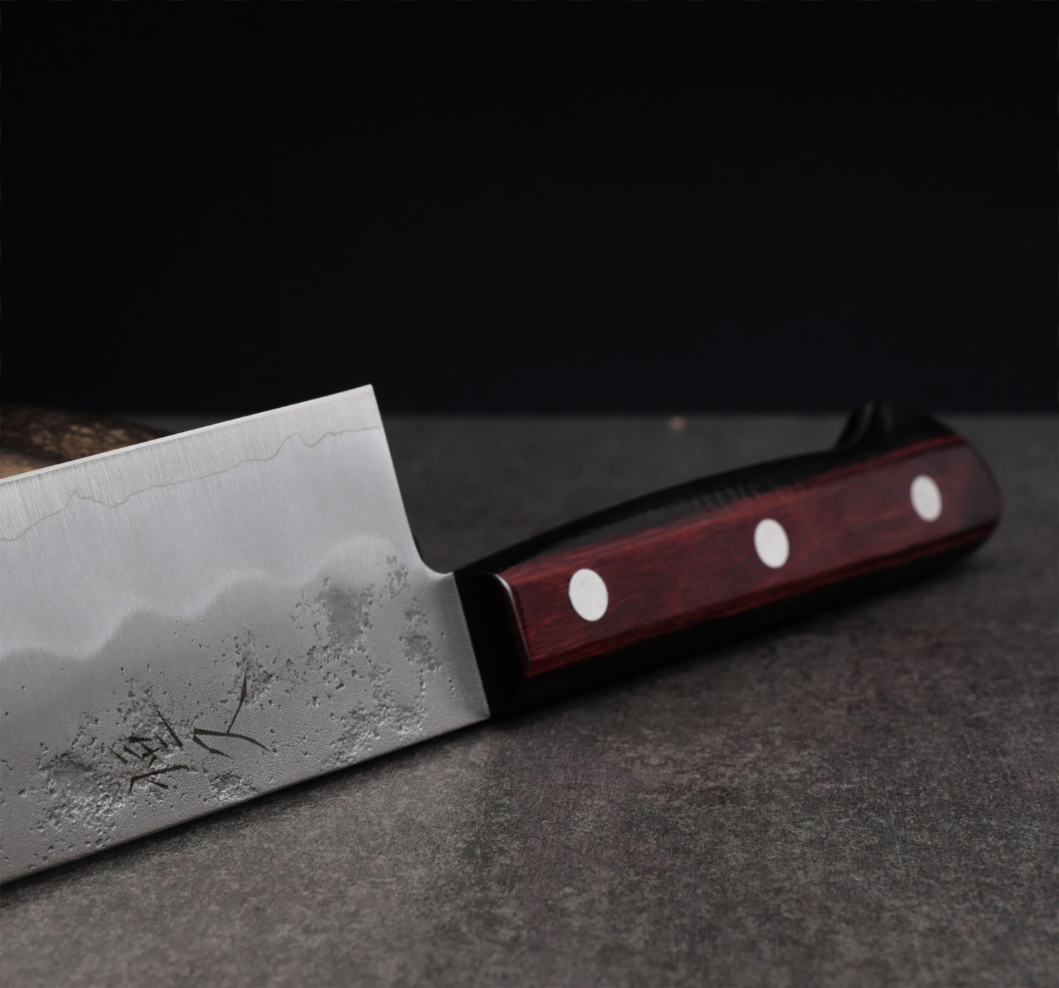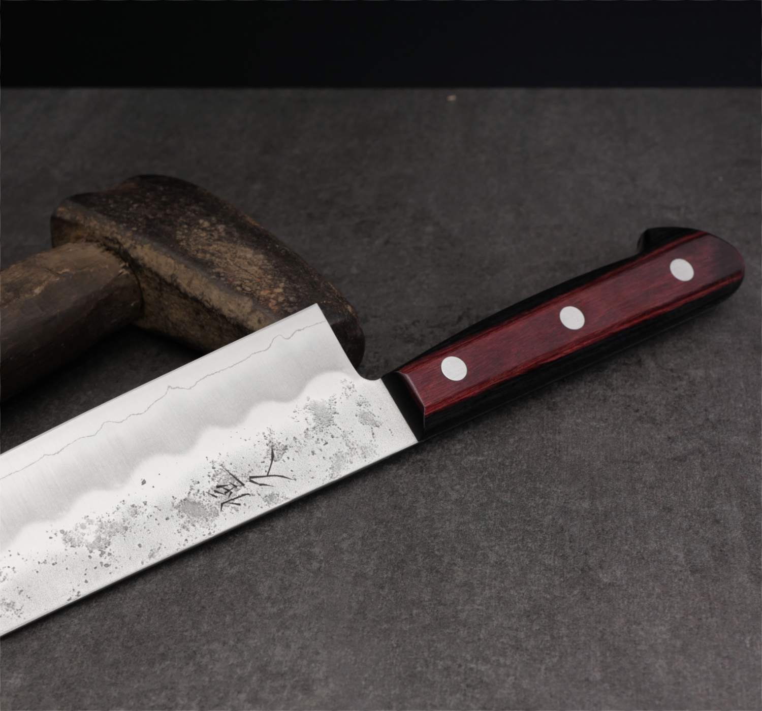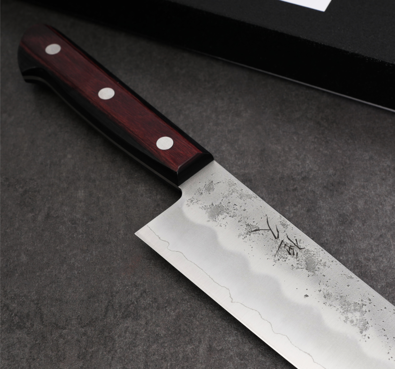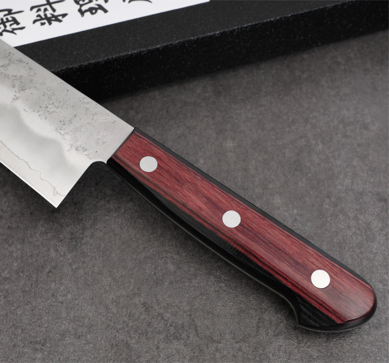 Kärnan består av Gingami #3, ett högklassigt rostfritt stål med en hårdhet på 61 HRC. Det ger en kniv som håller skärpan länge och samtidigt är lätt att vässa upp när det behövs. Kärnstålet omsluts av två lager rostfritt stål med en vackert grov nashiji-finish som ger bladet en rustik men elegant karaktär.