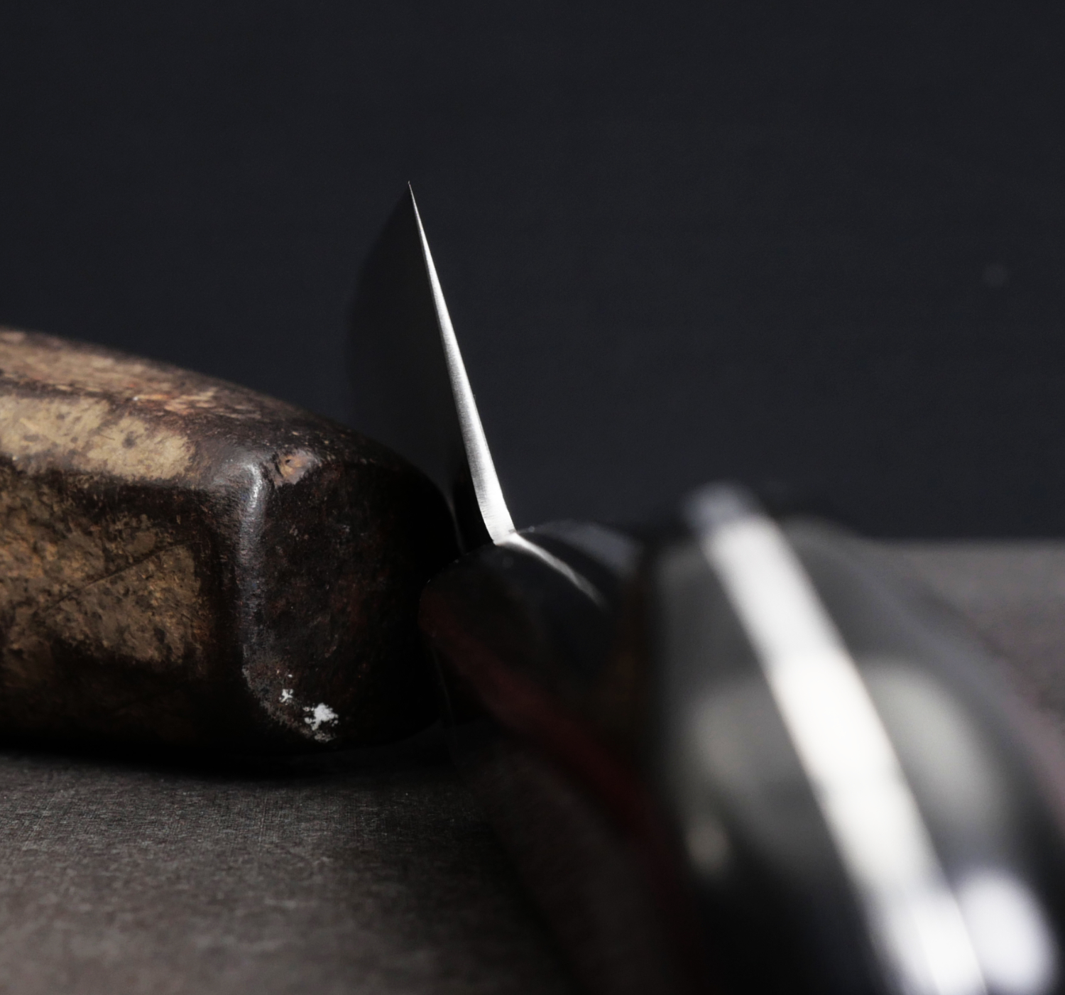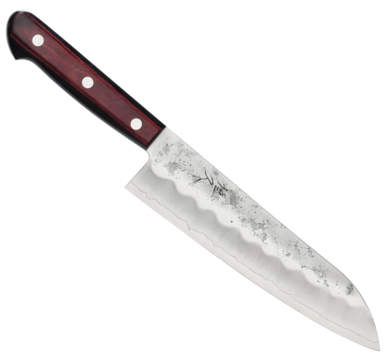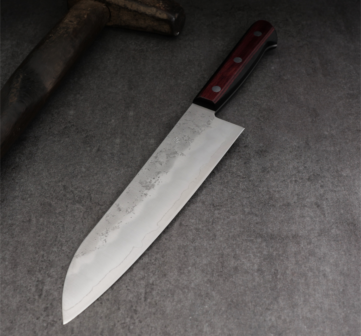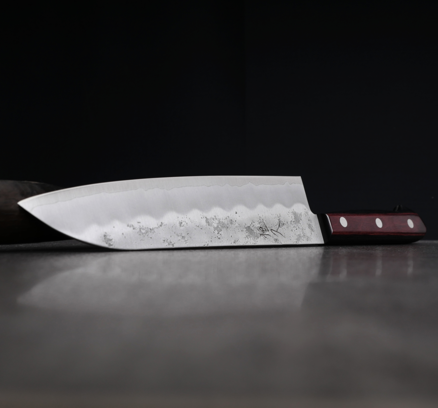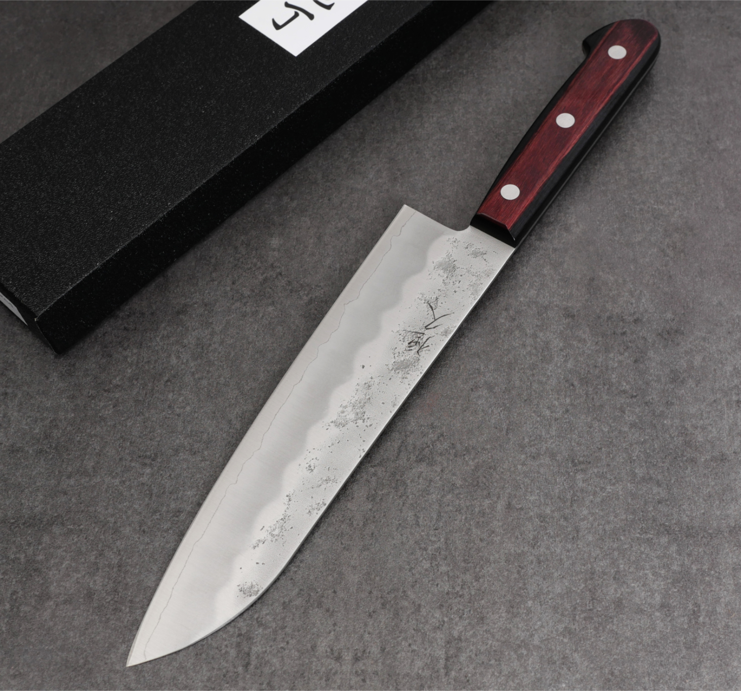 Kärnan består av Gingami #3, ett högklassigt rostfritt stål med en hårdhet på 61 HRC. Det ger en kniv som håller skärpan länge och samtidigt är lätt att vässa upp när det behövs. Kärnstålet omsluts av två lager rostfritt stål med en vackert grov nashiji-finish som ger bladet en rustik men elegant karaktär.