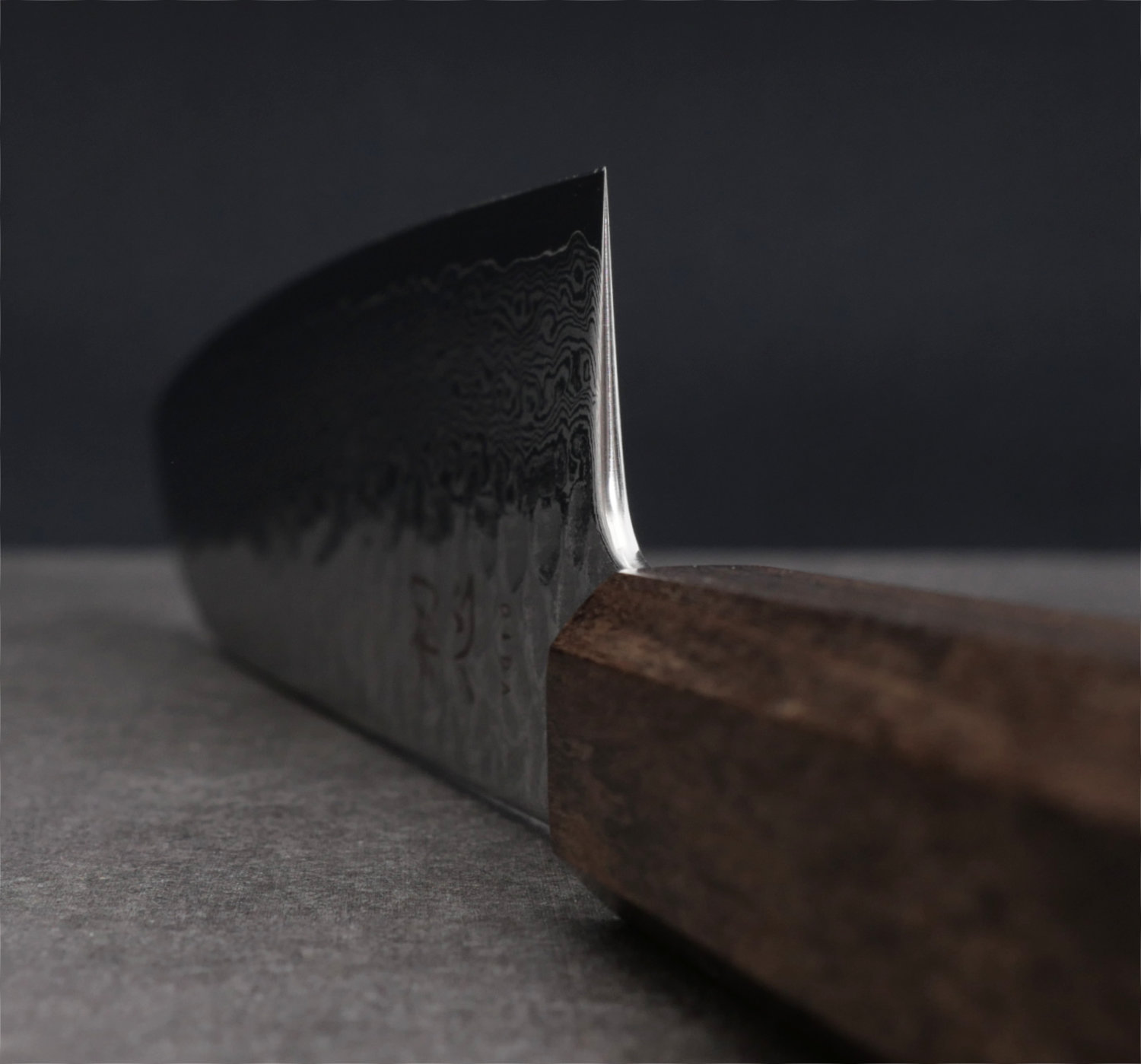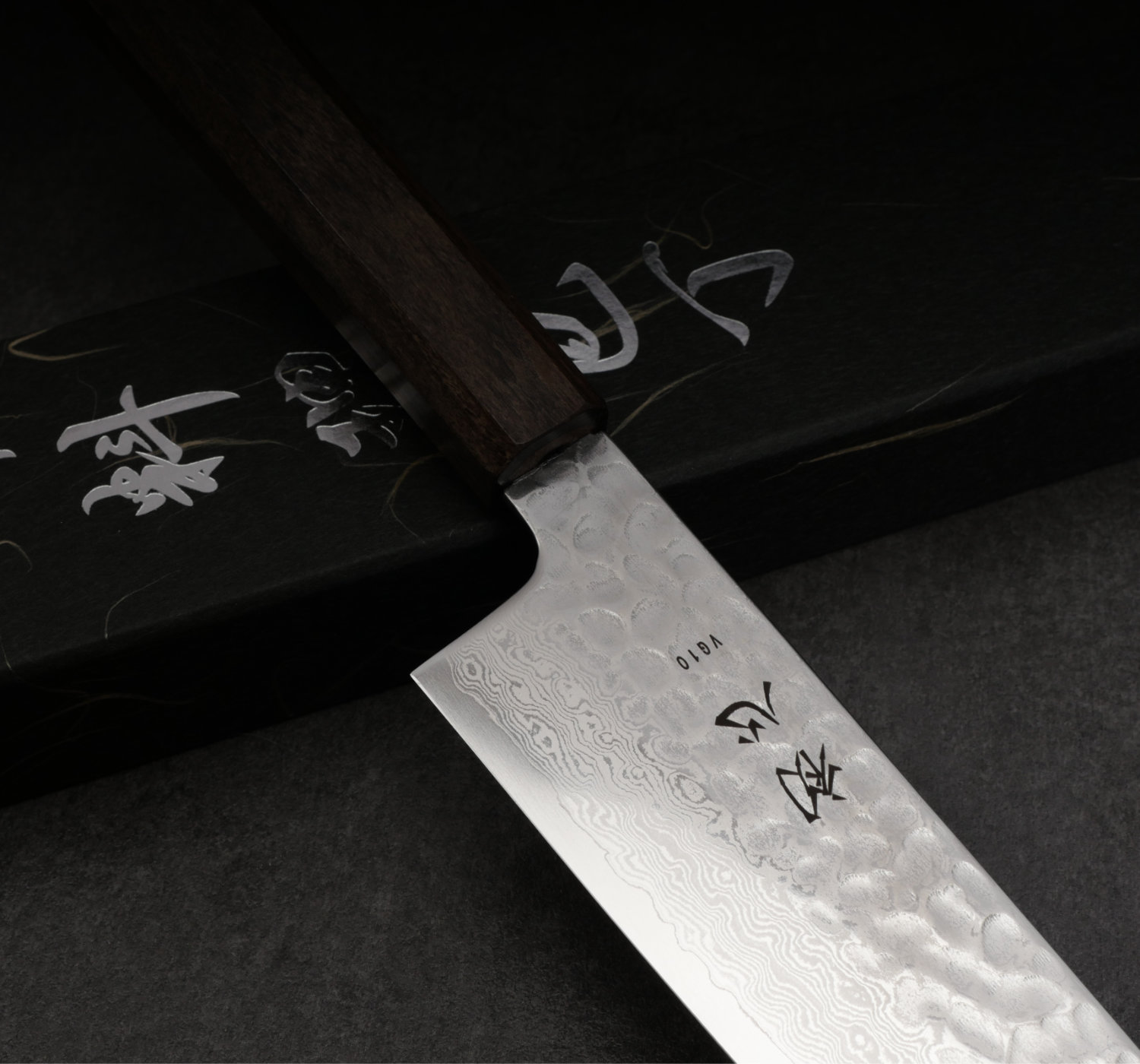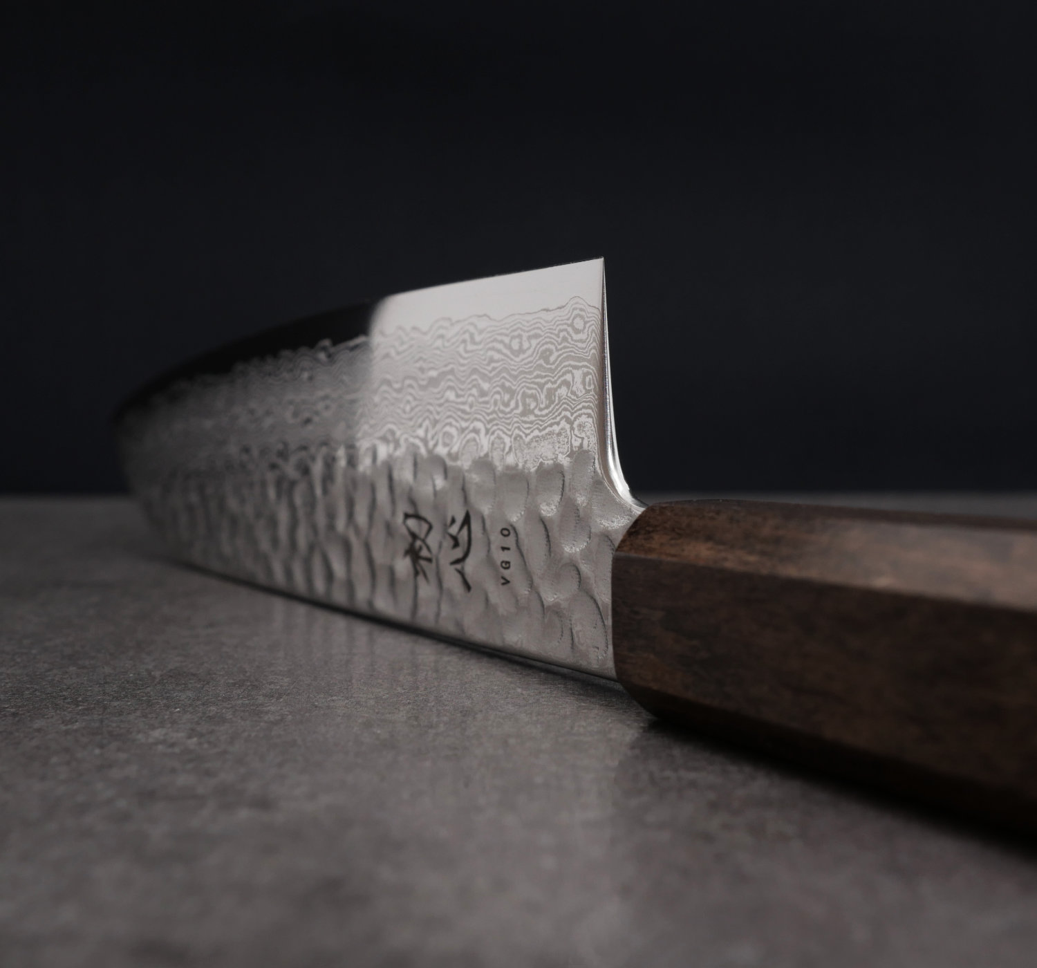 Bladet är tillverkat av det mycket populära och högpresterande stålet VG10 (rostfritt stål). Runt kärnstålet ligger 32 lager mjukare stål som skapar ett vackert damaskusmönster. Den övre delen på bladet har hammarbankats och polerats till en halvblank yta. Skaftet är åttakantigt och tillverkas av träslaget bubing.
