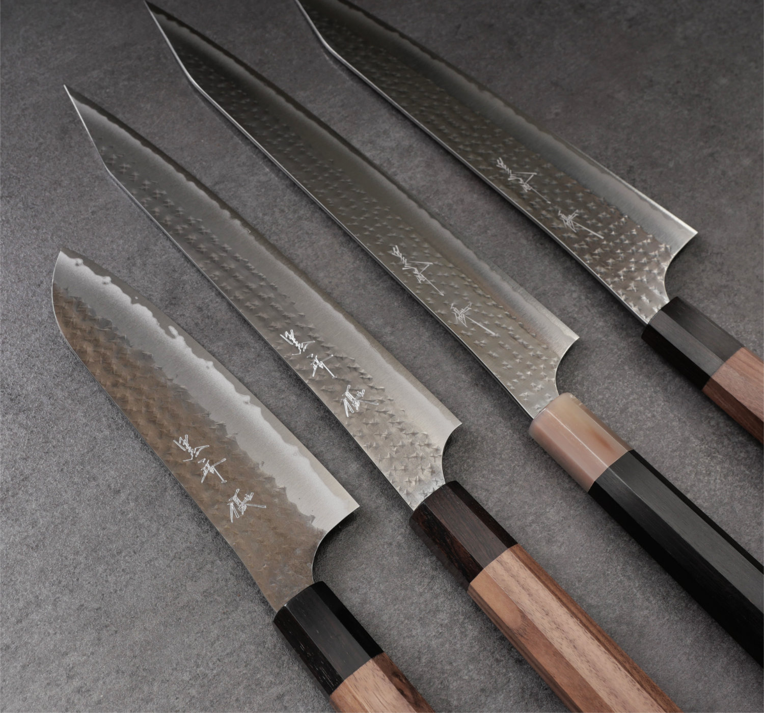 Yu Kurosaki 'Kokusen'. Kurosaki knivar är bedårande vackra. Formgivningen är kreativ och materialvalen håller alltid toppklass. I denna serie kombinerar han det toppresterande kolstålet aogami super med hammarbankade bladsidor som svärtas och poleras. Bladen är mycket tunna och håller skärpan exeptionellt länge tack vare det hårda kolstålet aogami super.