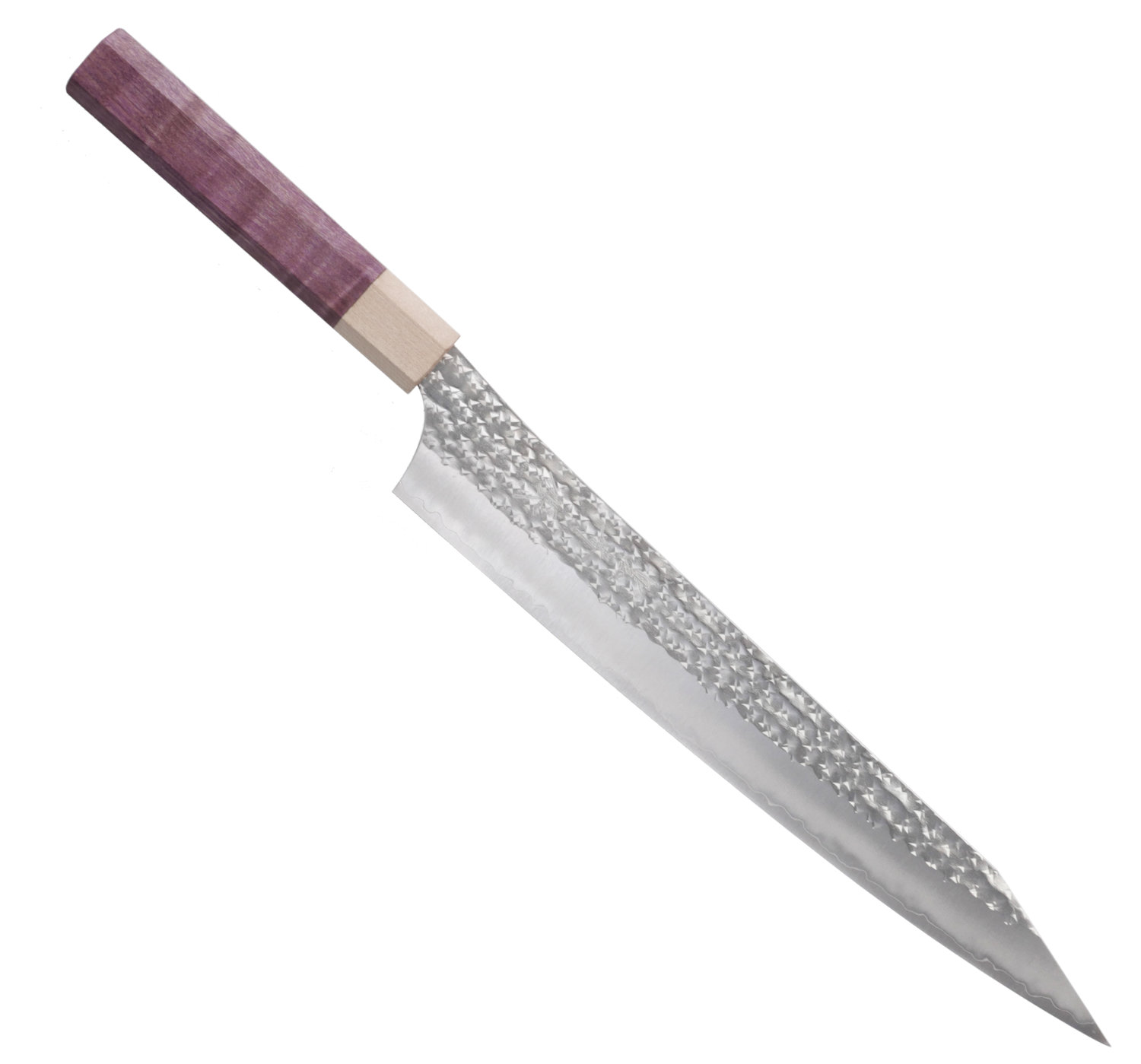 Sujihiki slicer med 27 cm långt blad. Detta exemplar har ett vackert skaft i stabiliserad lönn.