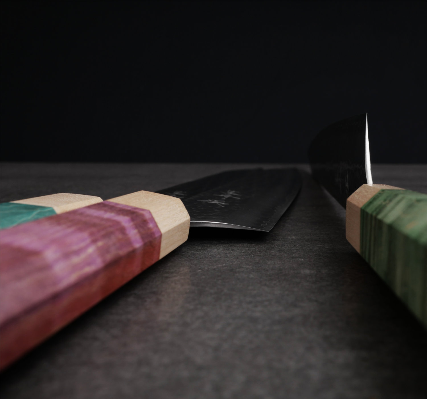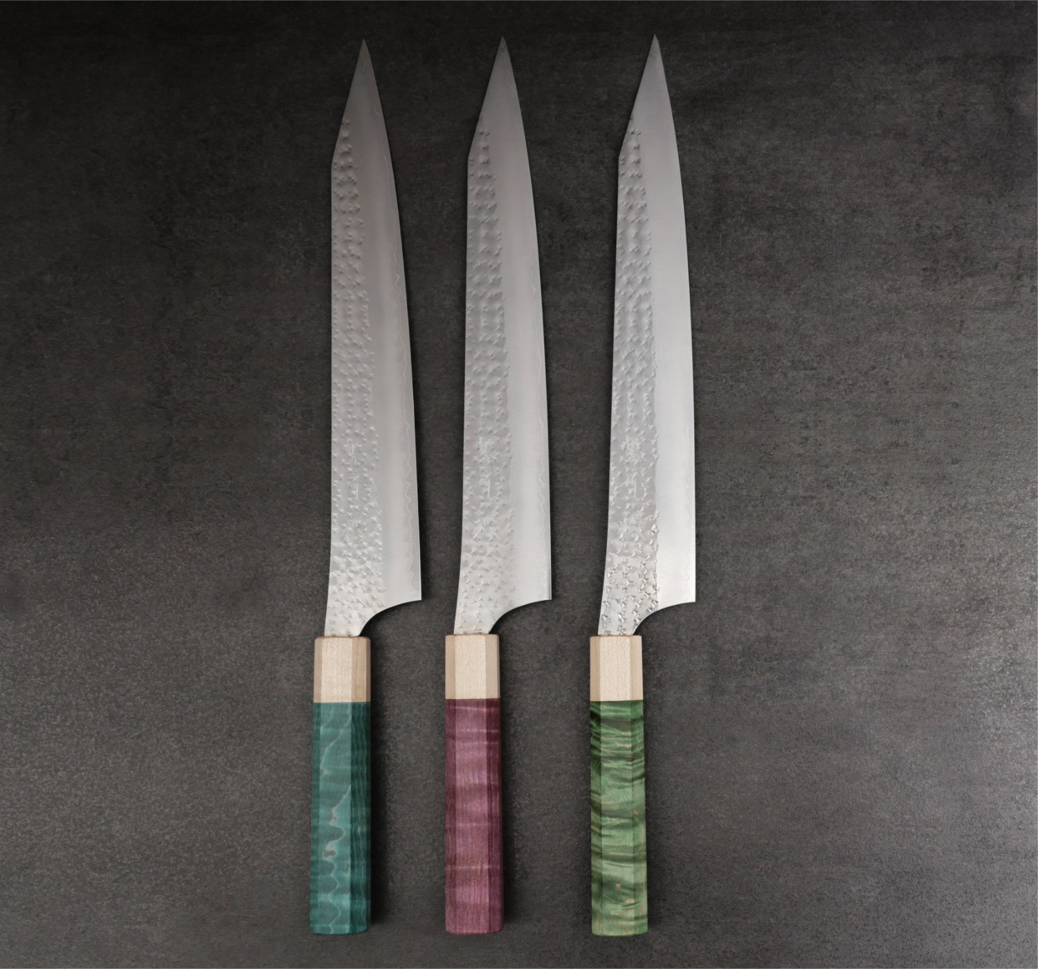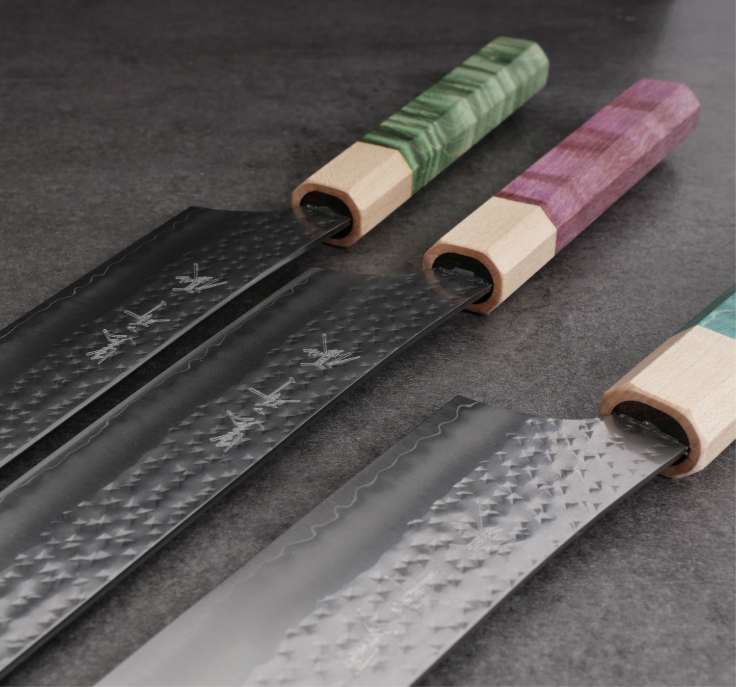 Yu Kurosaki tillhör den nya generationen av japanska smeder. Hans knivar är bedårande vackra och han använder enbart marknadens främsta material. I denna serie kombinerar han det toppresterande rostfria pulverstålet SG2 med hammarbankade bladsidor som polerats skinande blanka. Till detta monteras ett vackert 8-kantigt träskaft. Bladen är mycket tunna och håller skärpan exeptionellt länge tack vare det hårda pulverstålet. Vikten är väl avvägd och knivarna ligger suveränt i handen.