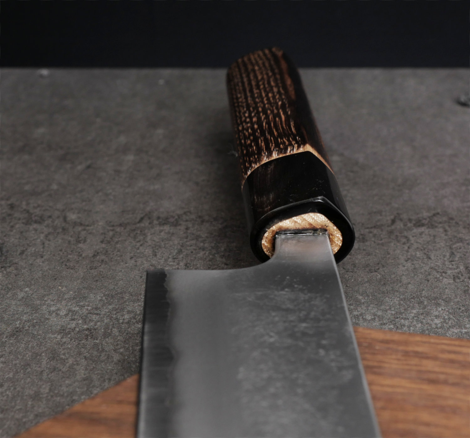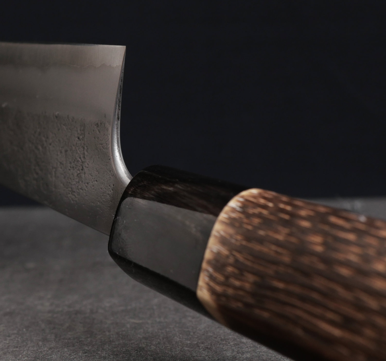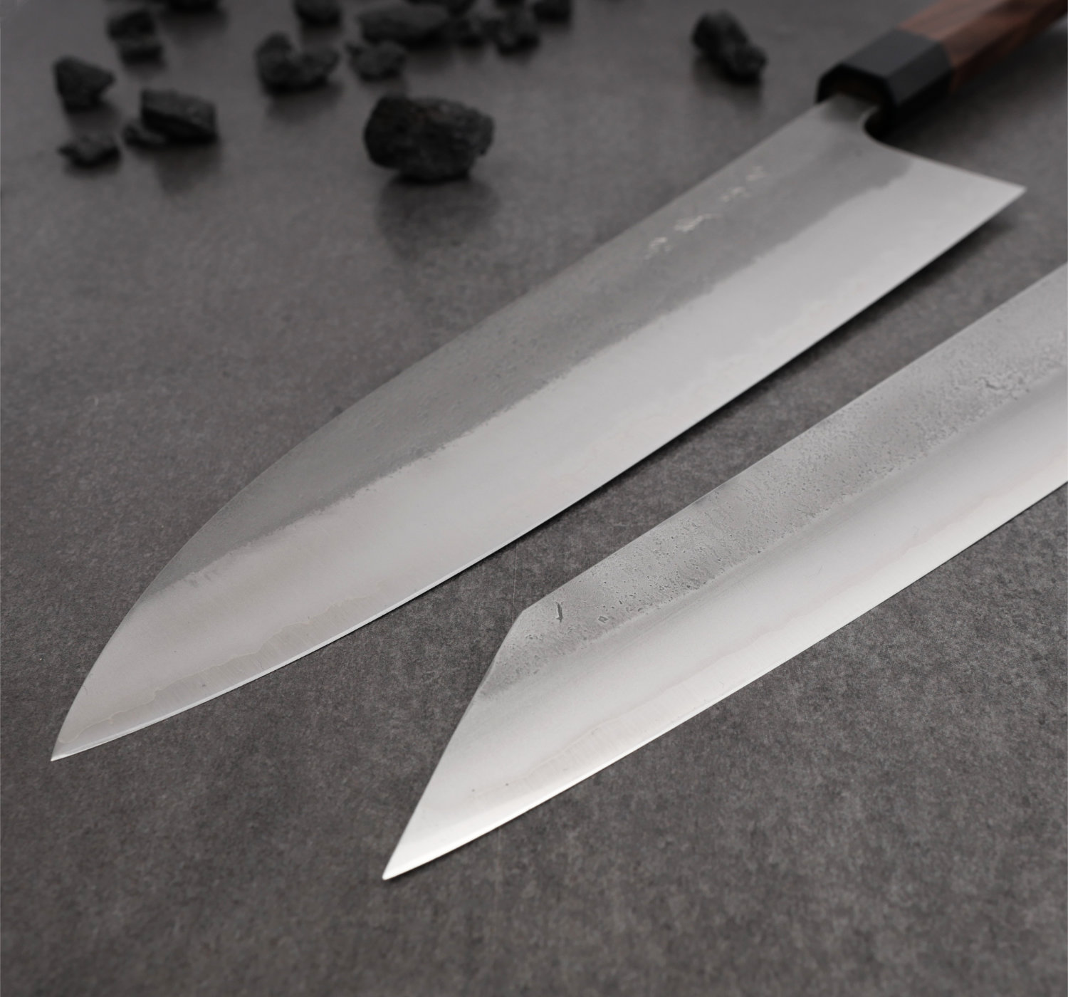 Kärnstålet, aogami#2, är ett hårt kolstål som tar en aggressiv egg som håller skärpan länge. Finishen heter nashiji, en rå och skrovlig yta. Knivarna har tunna eggar och dom ligger suveränt i handen. Skaftet är åttakantigt och tillverkas av valnöt.