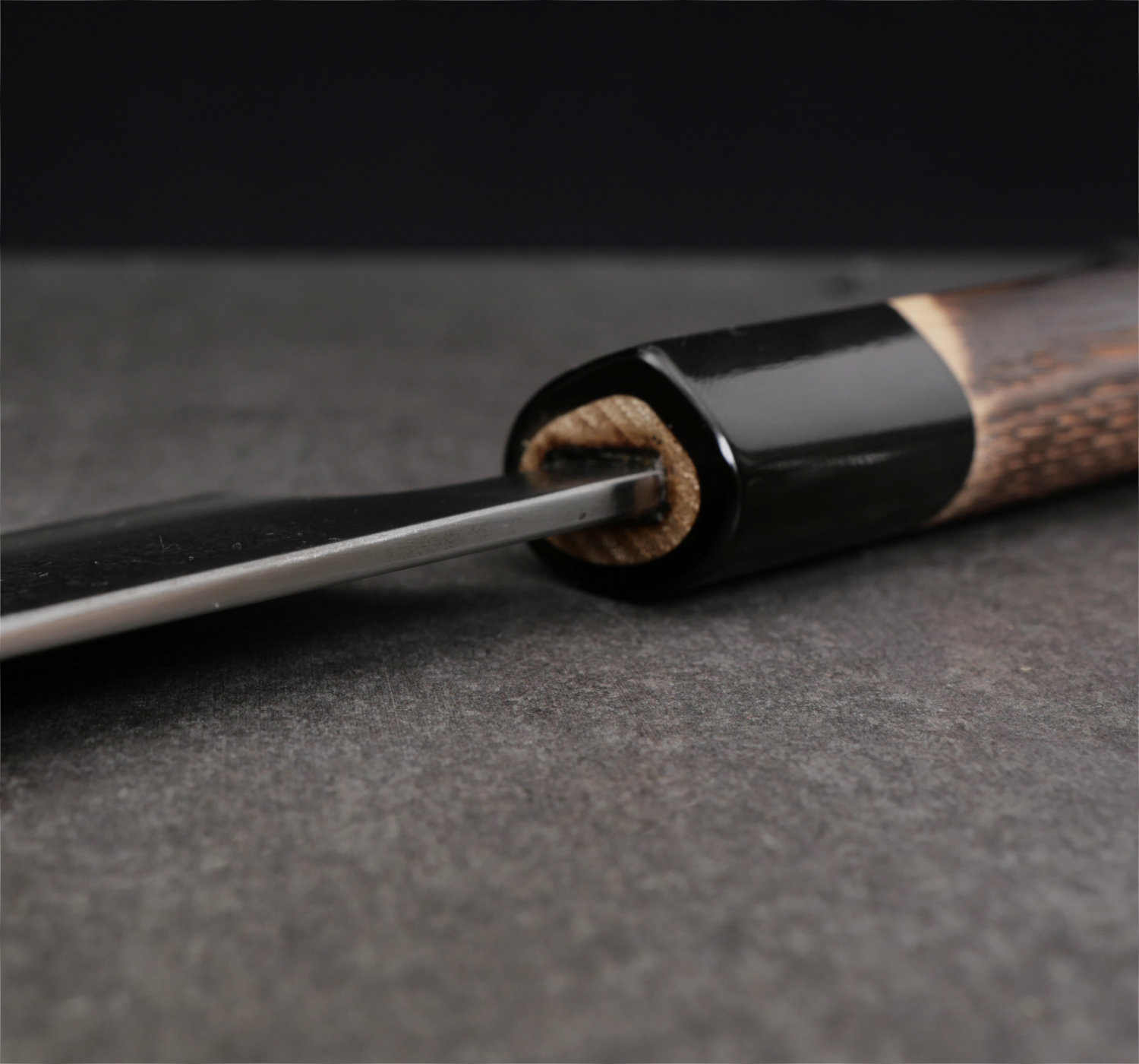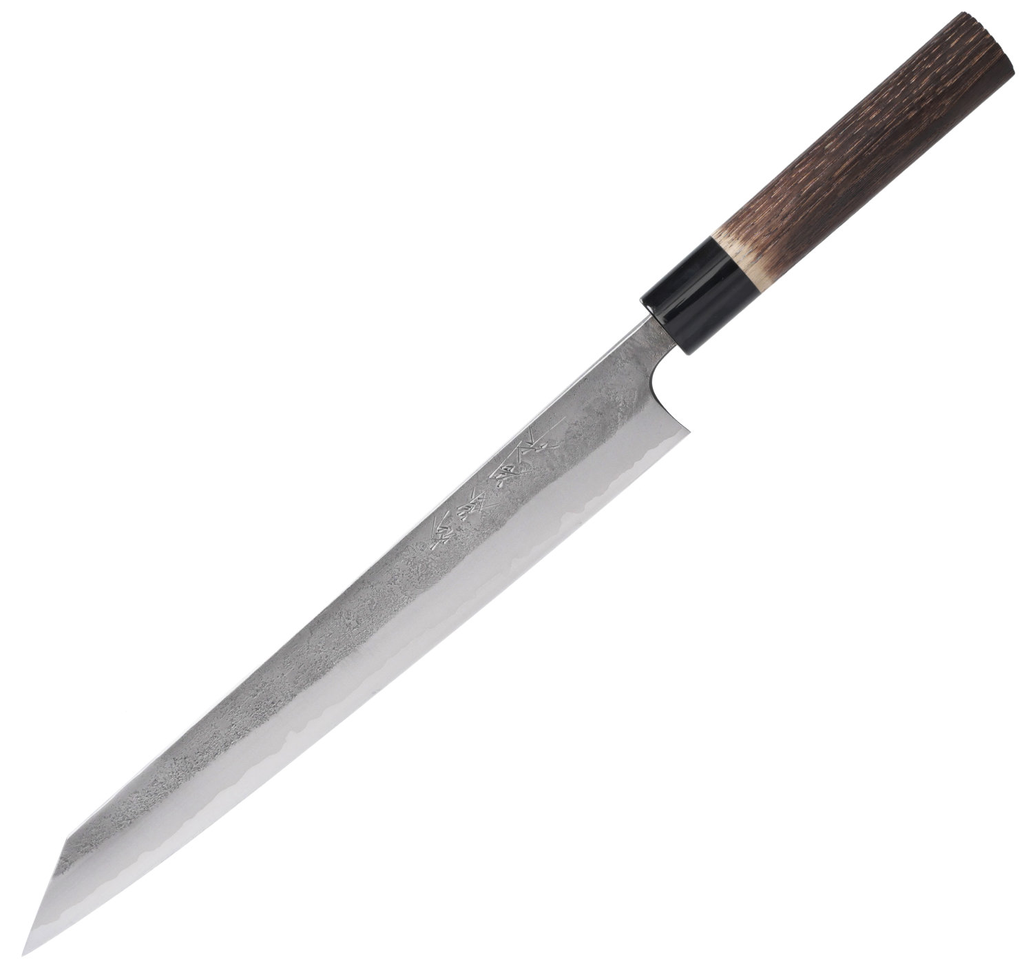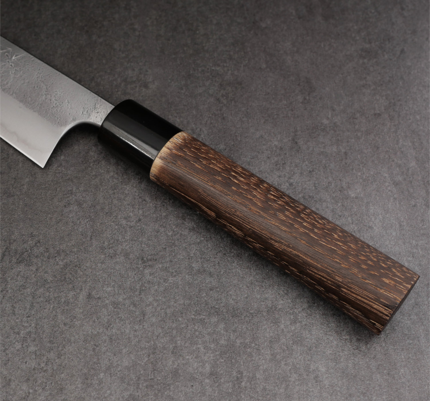 Kärnstålet, aogami#2, är ett hårt kolstål som tar en aggressiv egg som håller skärpan länge. Finishen heter nashiji, en rå och skrovlig yta. Knivarna har tunna eggar och dom ligger suveränt i handen. Skaftet är åttakantigt och tillverkas av valnöt.