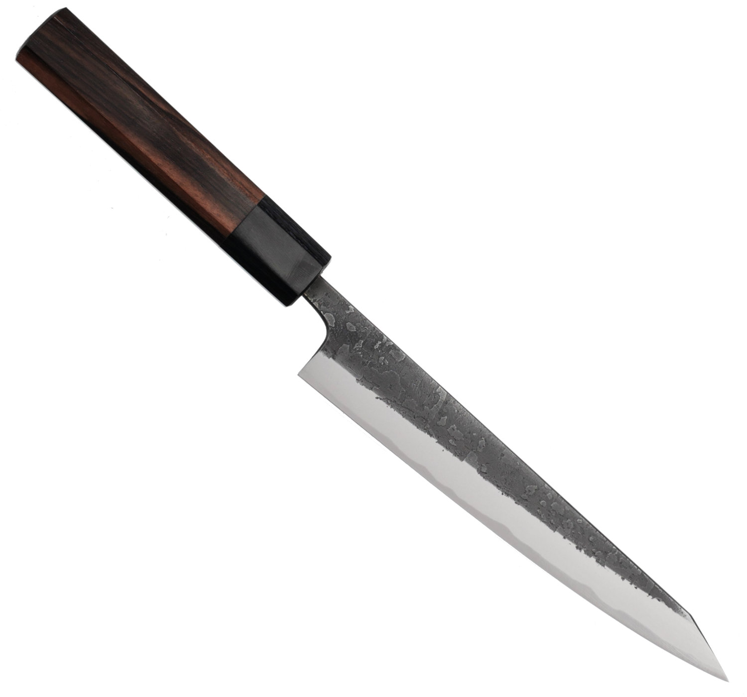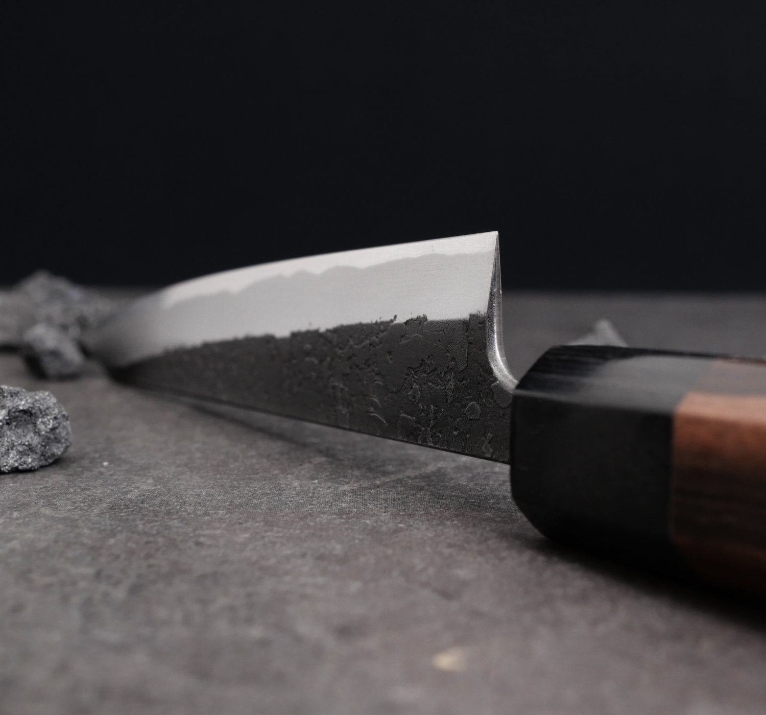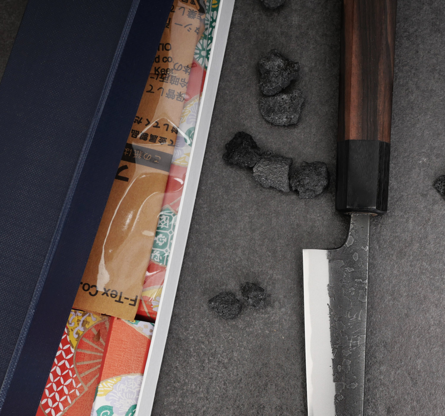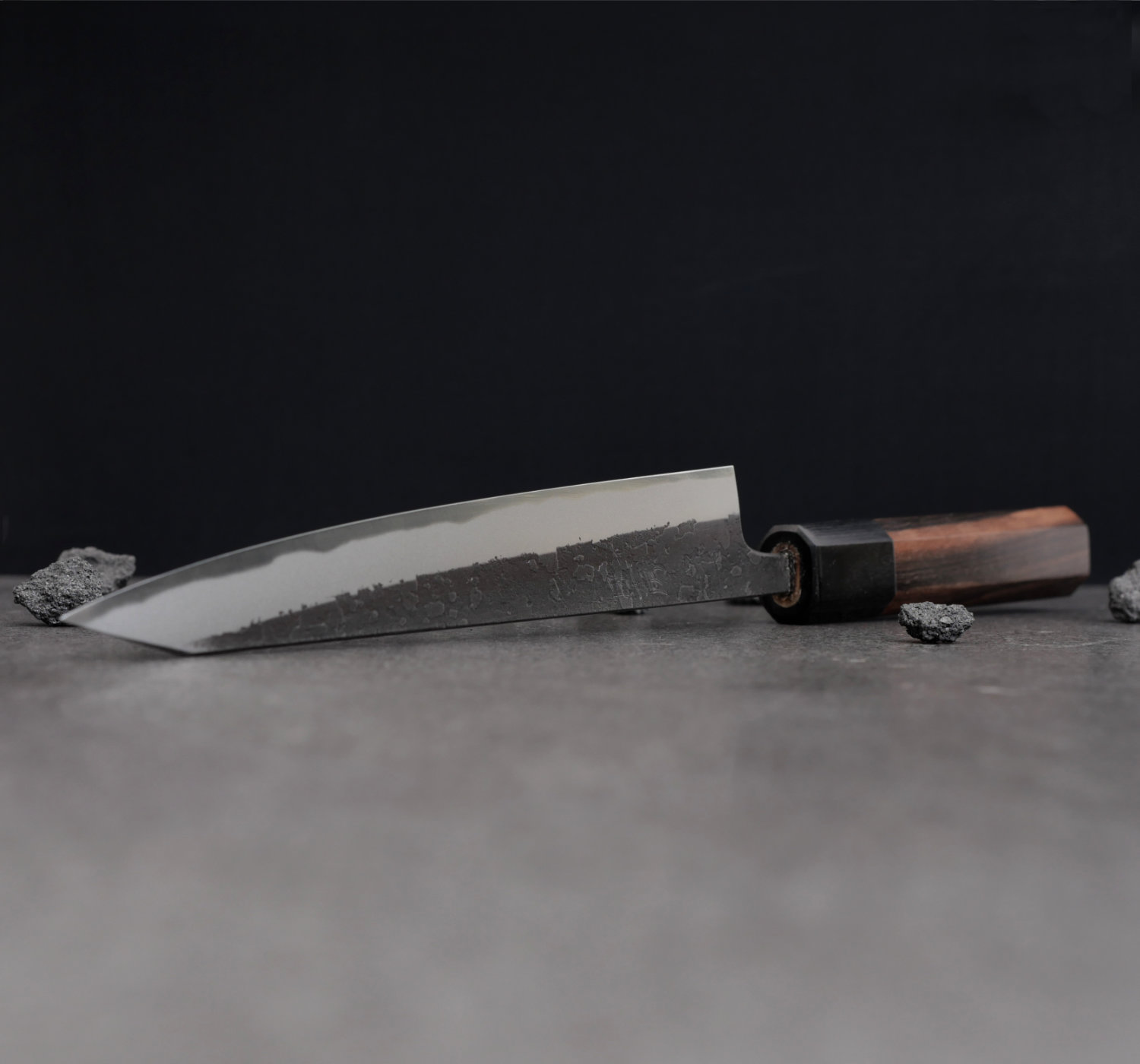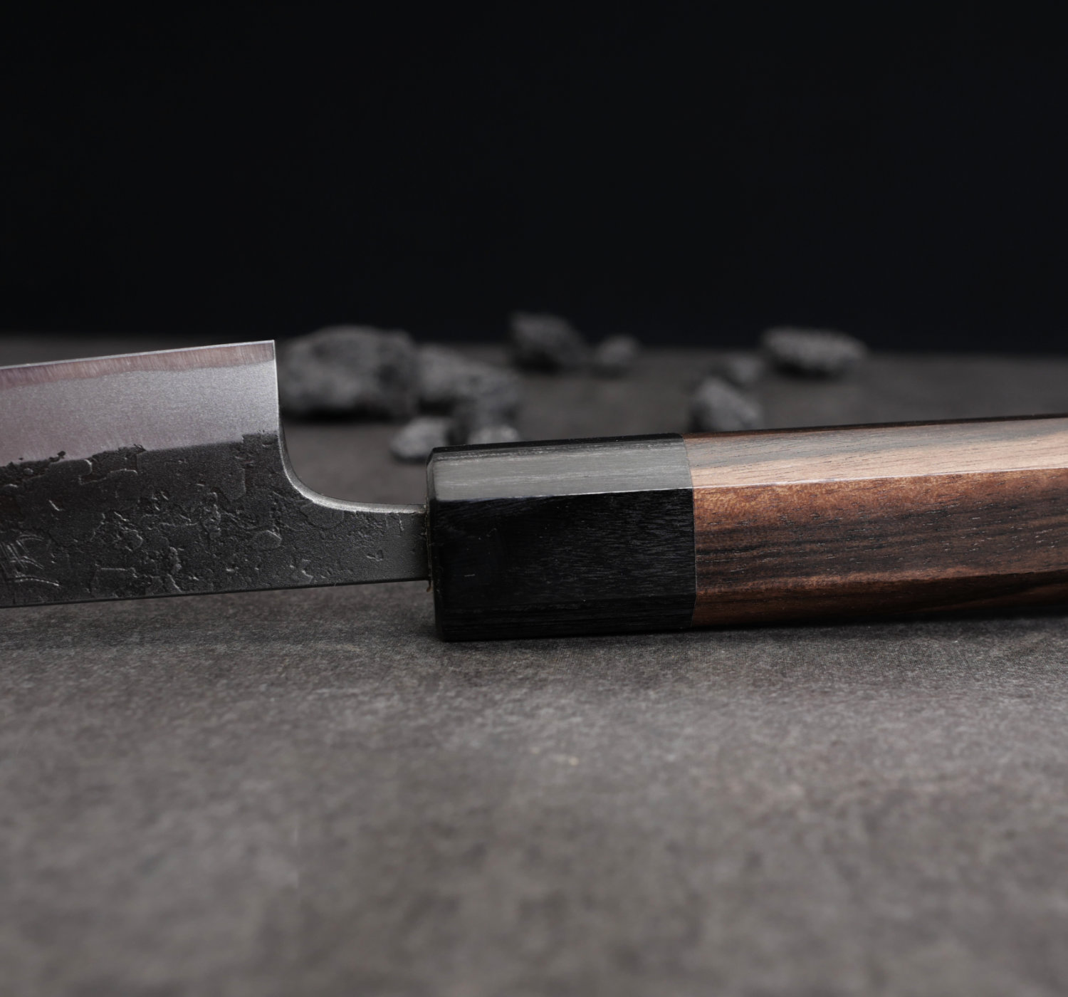 Toshihiro Wakui är mycket talangfull och han tillverkar väldigt välsmidda knivar i kolstål. I denna serie använder han kärnstålet är Aogami#2 som han väller ihop med mjukt järn (warikomi). Det vanliga är att smeder köper in färdiglaminerat stål, men Wakui väller numer samman sitt eget bladmaterial för att få det exakt som han vill. Bladets finish kallas nashiji kurouchi vilket är en grov och svärtad yta. Trots den råa finishen har Wakui rundat av alla kanter och gett bladet mjuka former. Han taperar bladen med stor skicklighet (avsmalning från rygg till spets) och kniven ligger därför väldigt bra i handen. Handtaget är åttakantig i träslaget macassar ebenholts. Det har väldigt fin lyster och bra vikt. Macassar ebenholts är väldigt dyrt men till denna serie behöver skaftet ha rätt vikt för att matcha bladets tyngd.