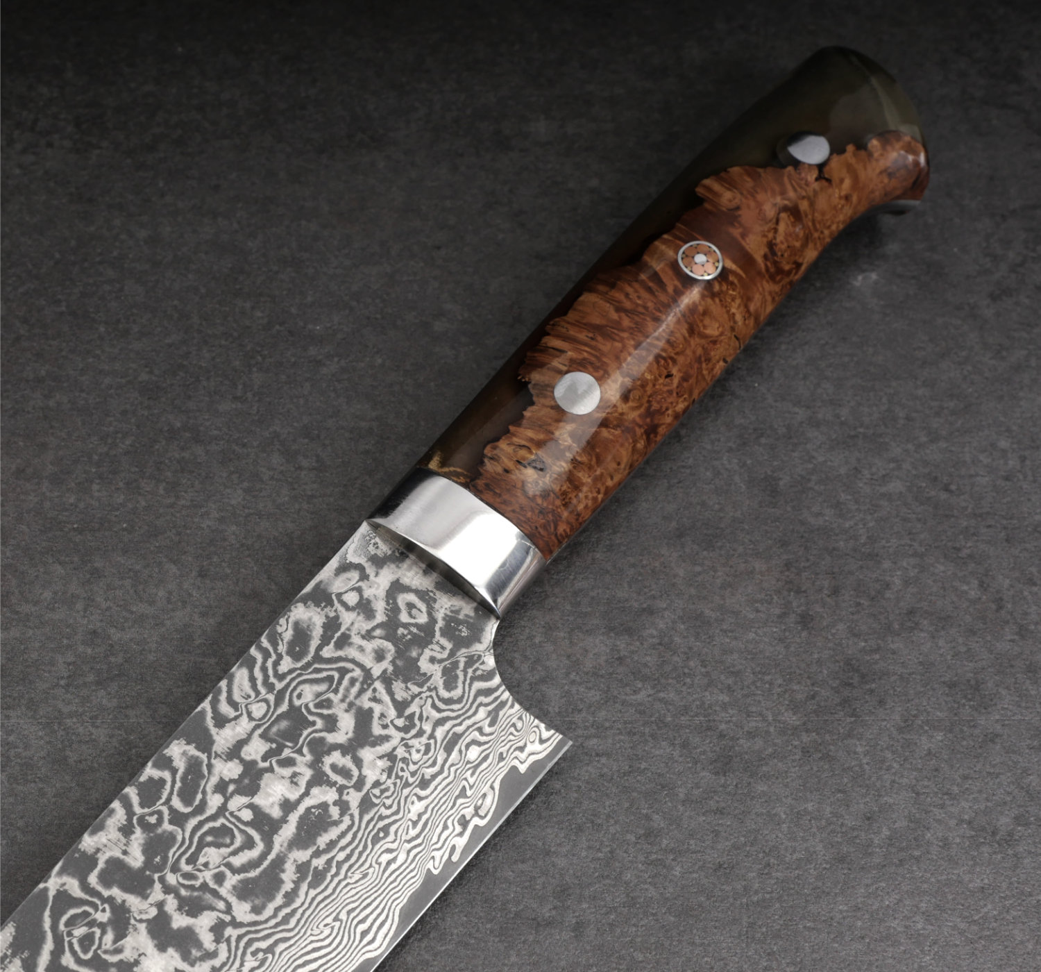 Den här lyxiga pjäsen tillverkas för hand i Sajis smedja i Takefu, Japan. Det är en begränsad utgåva med ett skaft i trä och transparent epoxy. Bladet, som är smitt för hand, består av flera lager nickeldamaskerat stål med en kärna av rostfritt pulverstål. Kniven levereras med en vacker kiribox med röd insida.