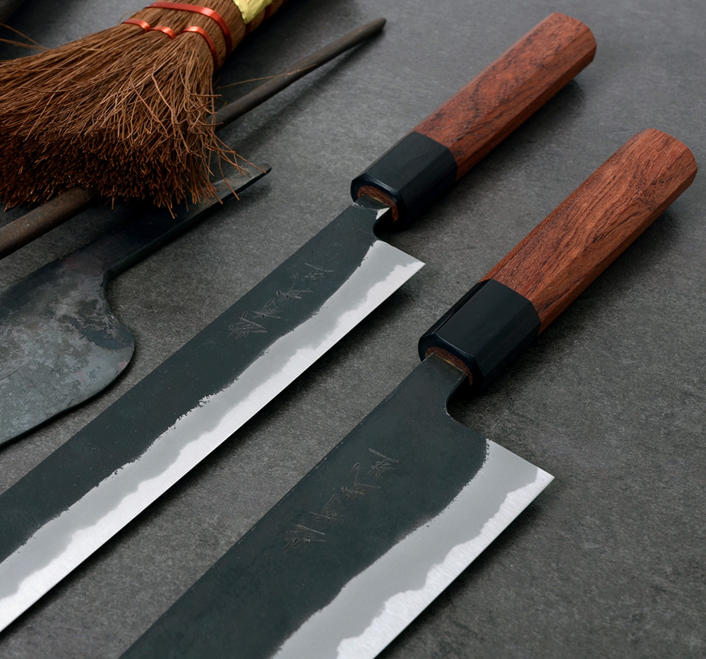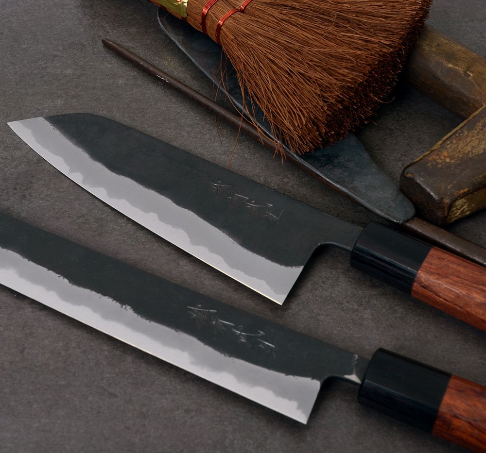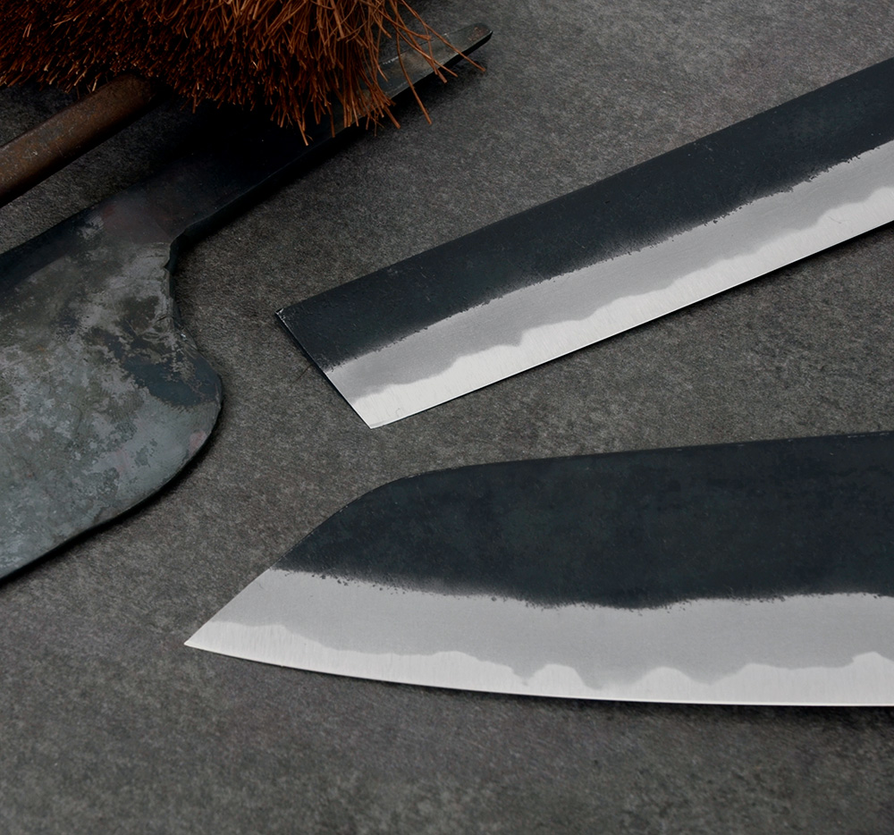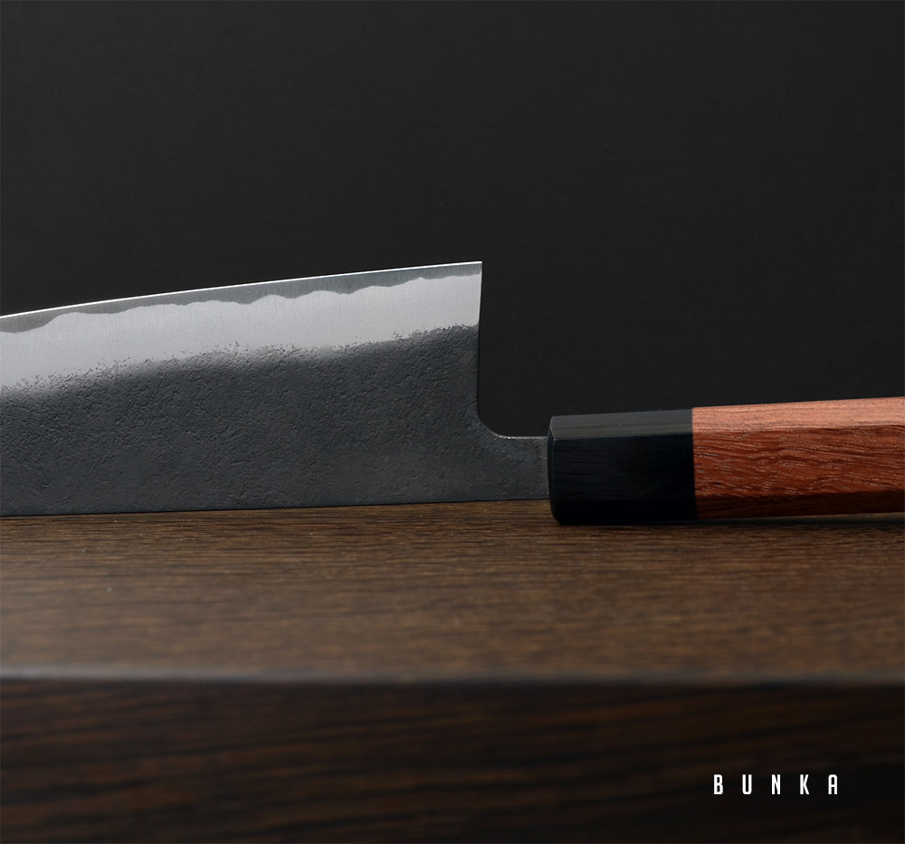 Shiro Kamo 'Kazan' är ett handsmitt precisionsinstrument från ett av de största namnen i Takefu, Japan. Shiro Kamo smider fram tunna och fina klingor med väl avvägd tapering och fin balans. Den tunna eggen i kolstålet shirogami#2 tar en våldsamt skarp egg och den höga kolhalten gör kniven lätt att både bryna och slipa. Runt kärnstålet ligger ett lager mjukt järn på vardera sida. Denna kappa har försetts med svartoxiderad kurouchi och en lätt nashijifinish. Nashiji betyder päronskal på japanska och det är ett sätt att förse bladsidan med en småskrovlig och rå yta.