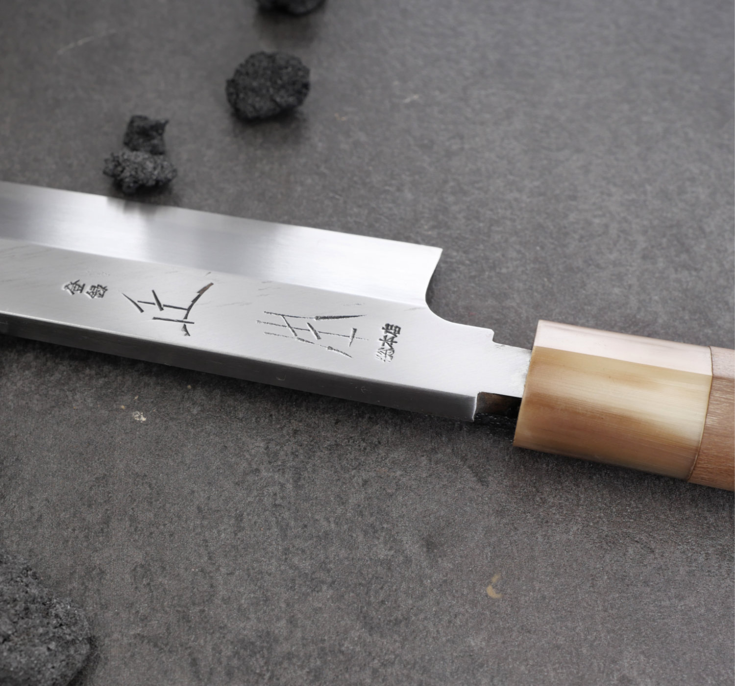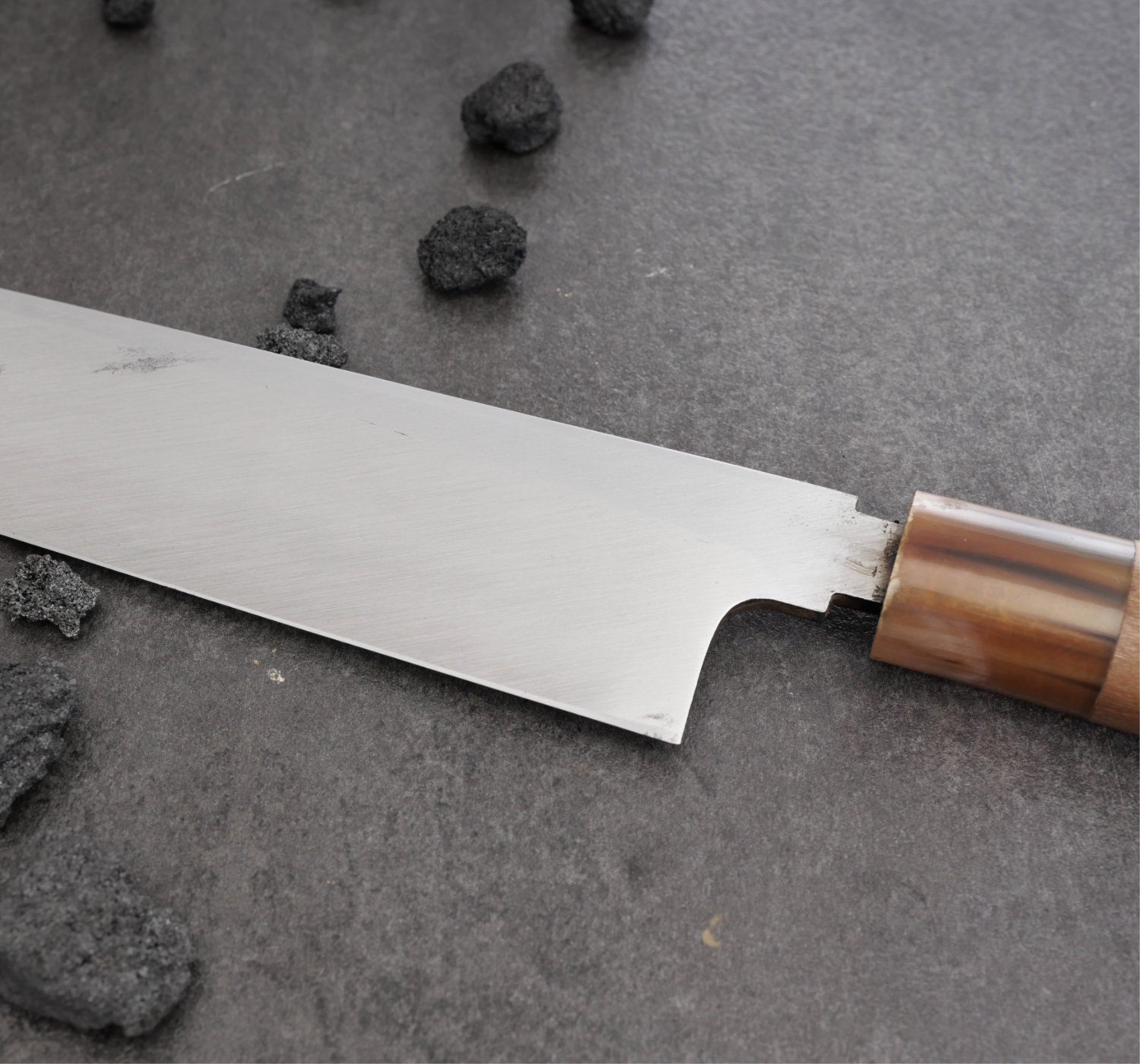 Med sitt 360 mm långa blad bär den alla kännetecken av en klassisk yanagiba: God vikt och styvhet, balanserad och med en stillsam auktoritet i linjerna. Det handtag i magnolia, sammanfört med ett blont bolster av buffelhorn, understryker traditionen och elegansen.