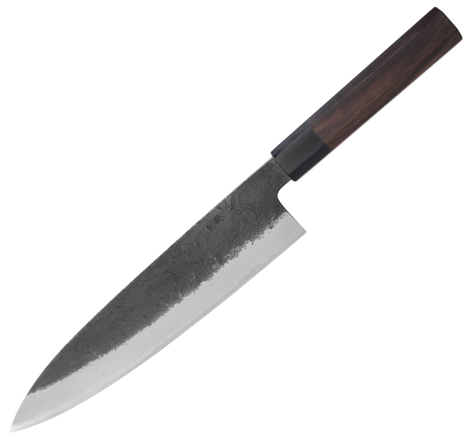 Bladets finish är nashiji kurouchi, vilket ger en rå och stilfull yta med svartoxiderad struktur. Kniven har ett åttakantigt skaft i rosewood med bolster i svart pakkaträ.