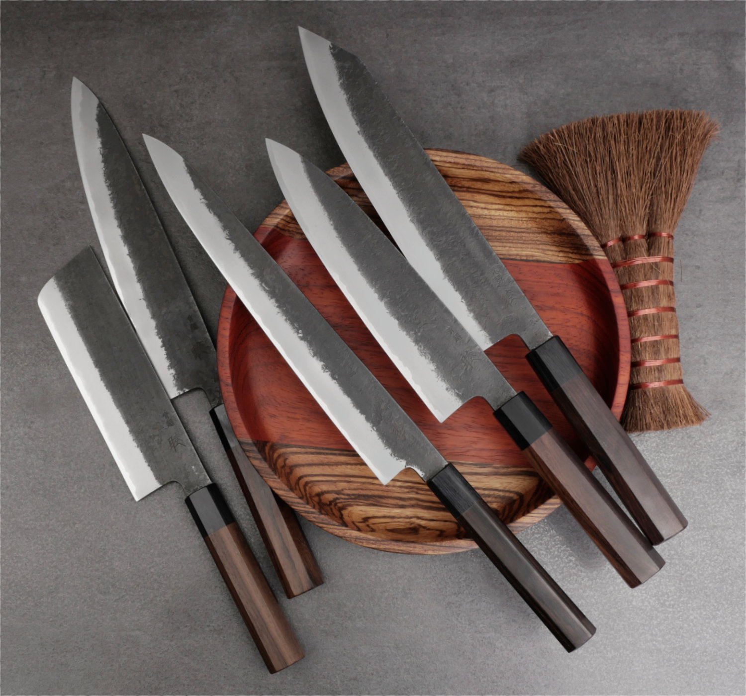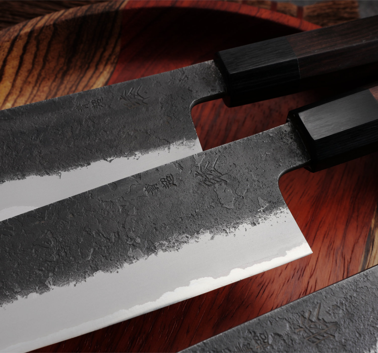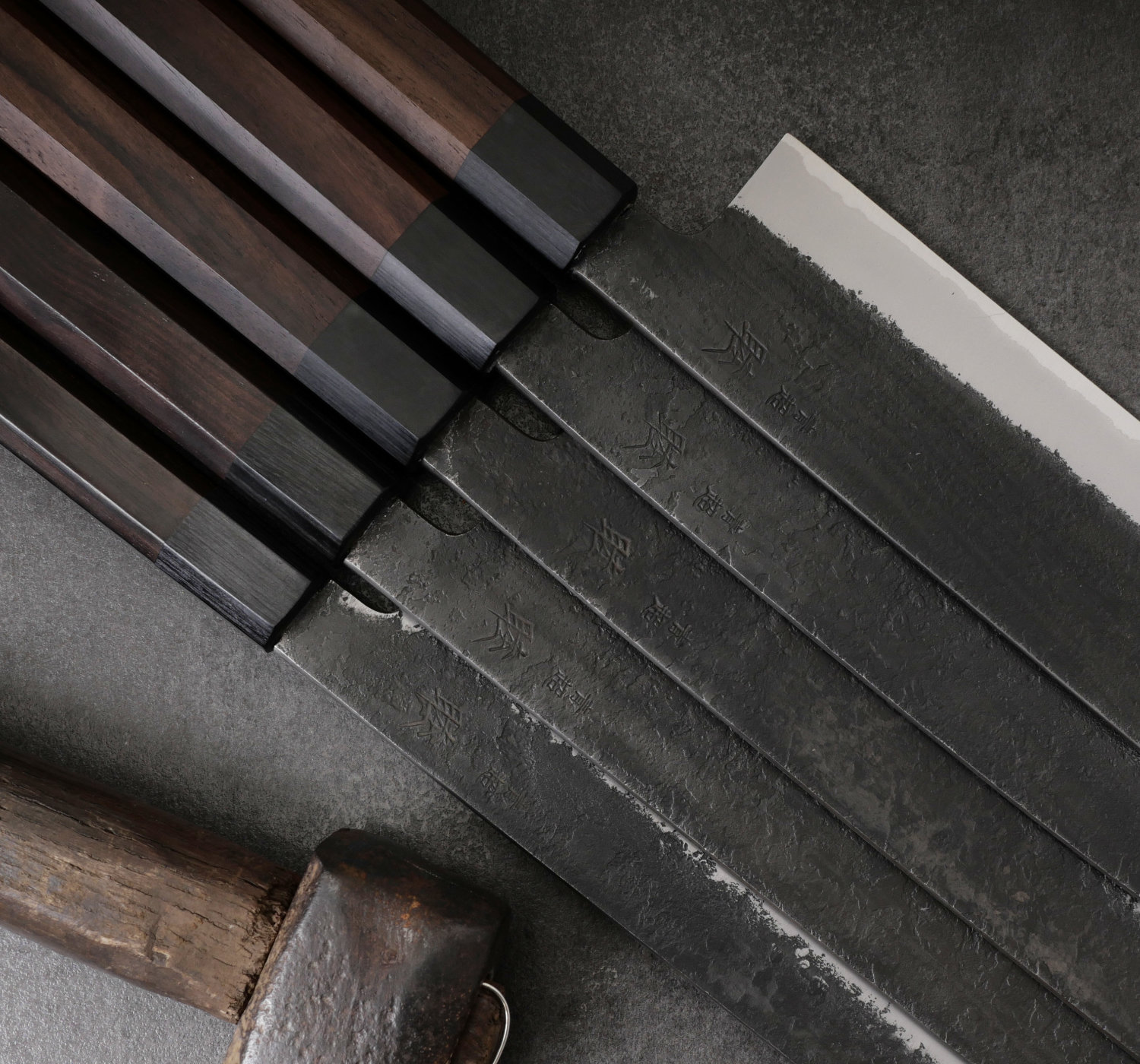 Mutsumi Hinoura är en högt aktad smed som arbetar i den lilla staden Sanjo i västra Japan. Alla knivar varmsmids för hand, och inget blad lämnar verkstaden utan att vara sylvasst och smitt till perfektion. I denna serie används kolstålet Aogami Super, härdat till 64 HRC, ett mycket hårt kolstål som håller skärpan länge och kan slipas till rakbladsvass nivå. Hinouras knivar är mycket eftertraktade och leveranstiderna är ofta mycket långa.