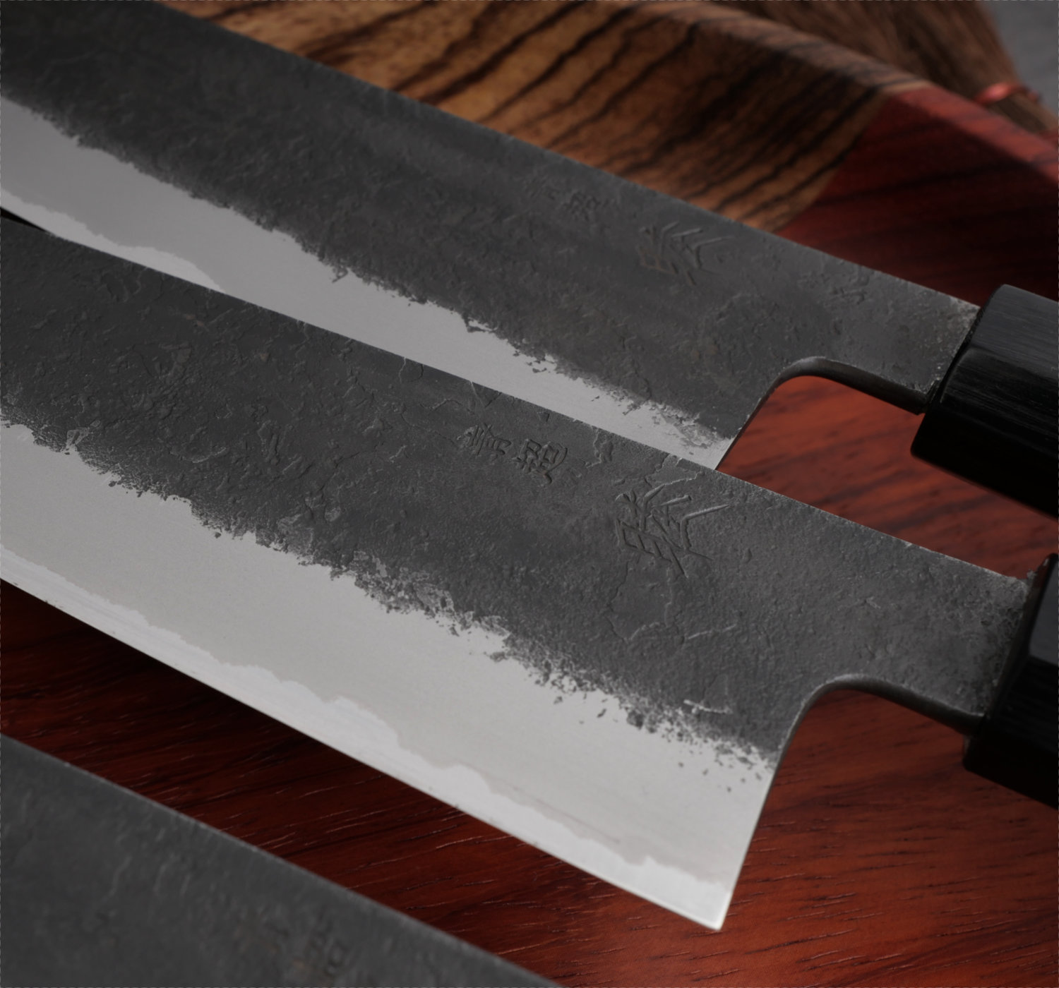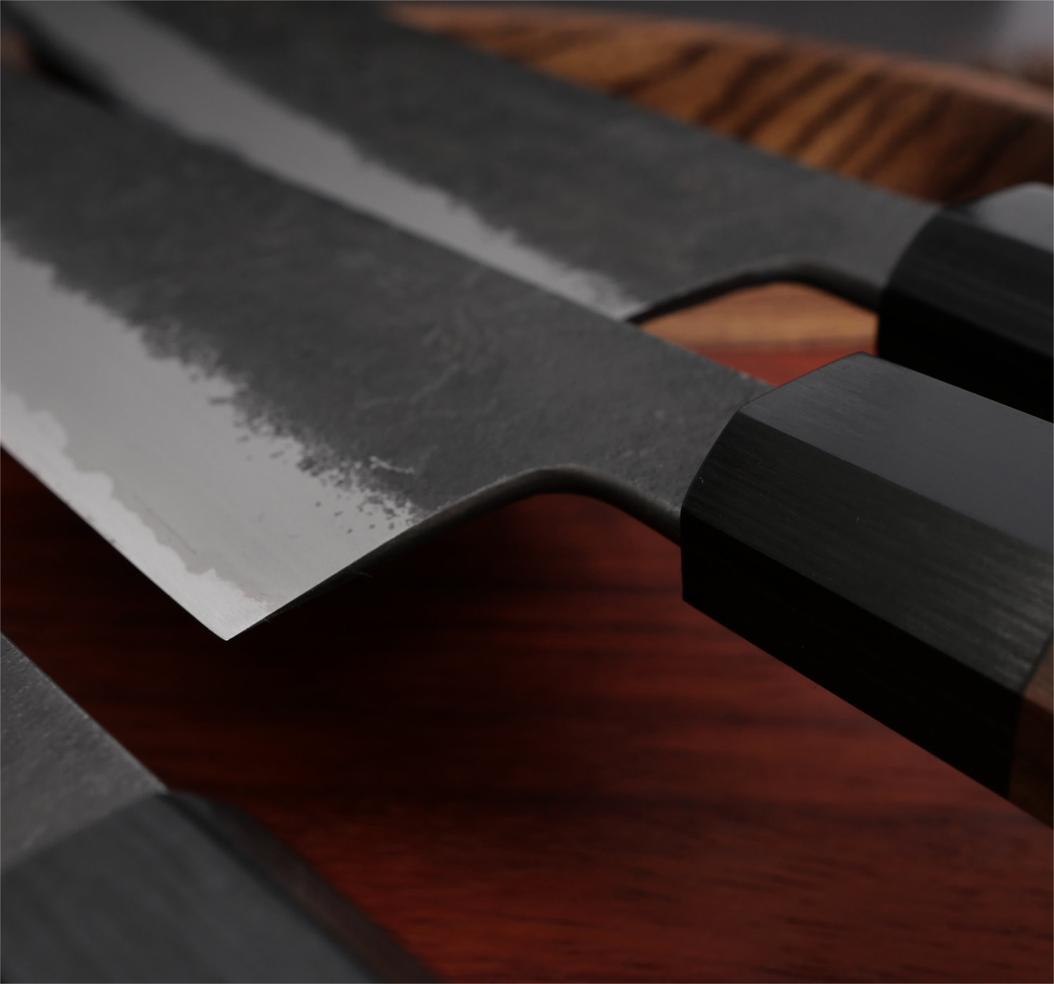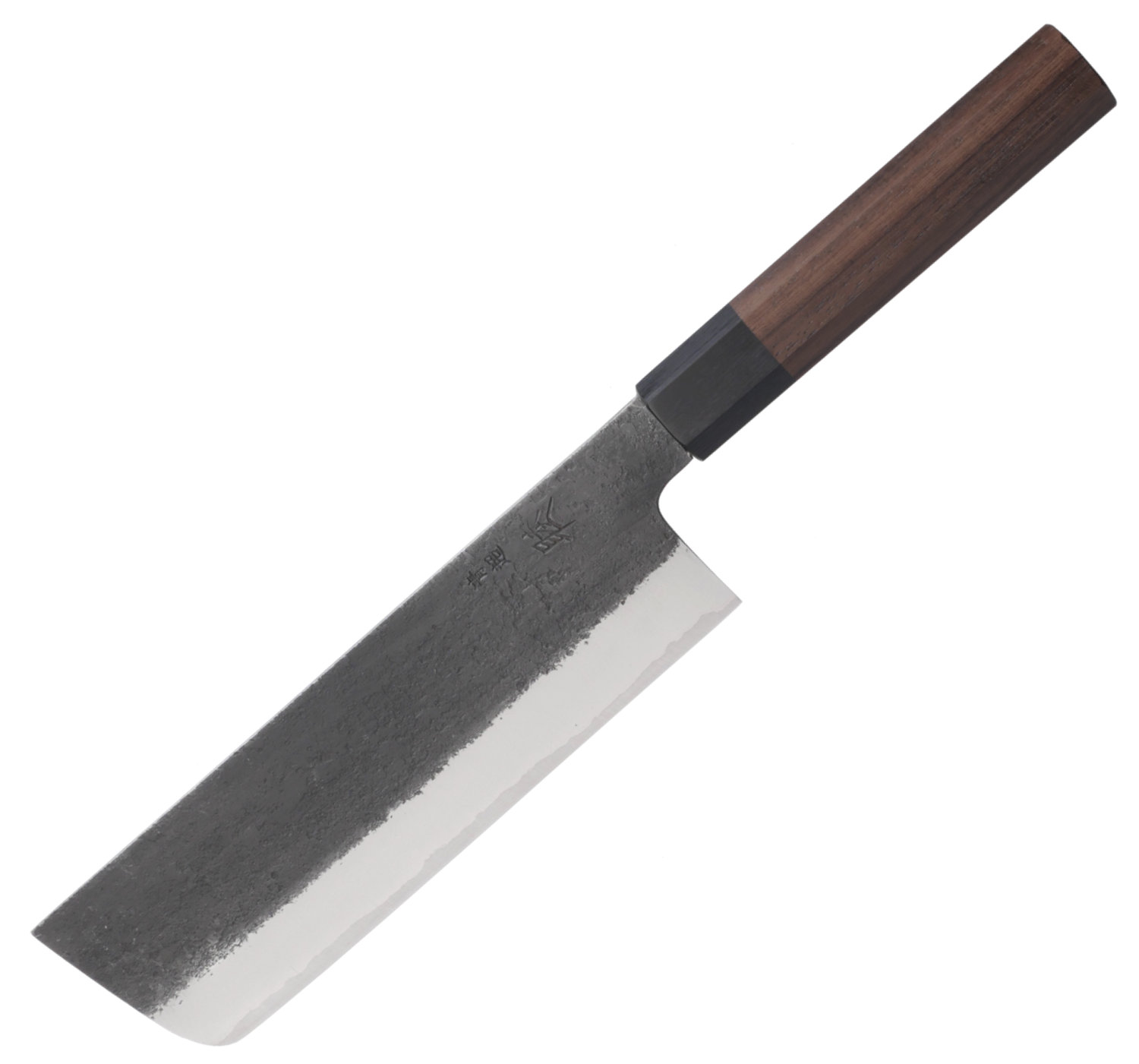 Bladets finish är nashiji kurouchi, vilket ger en rå och stilfull yta med svartoxiderad struktur. Kniven har ett åttakantigt skaft i rosewood med bolster i svart pakkaträ.