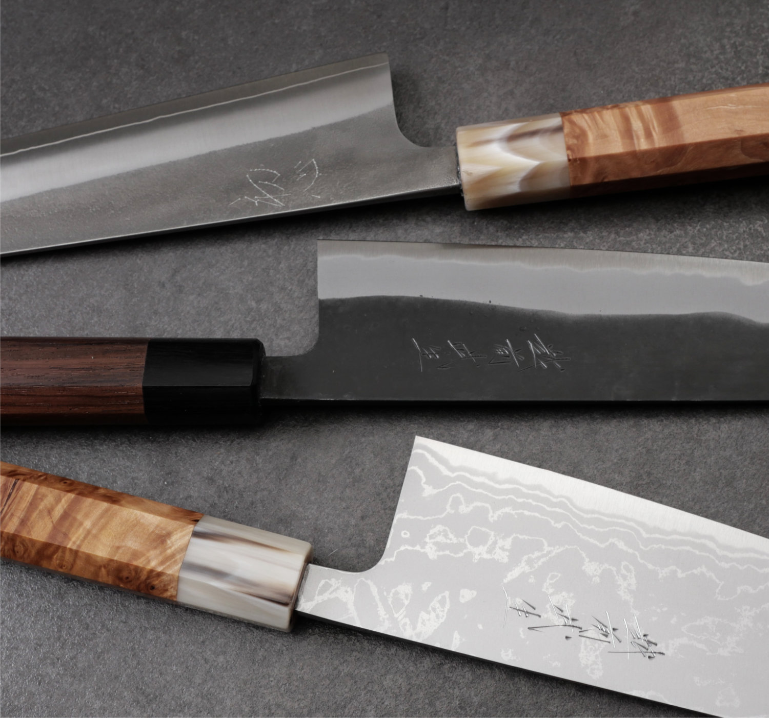 Shiro Kamo är en erkänt duktig smed från det hyllade sällskapet 'Takefu Knife Village' i Japan. Dessa knivar är tillverkade för hand i kolstålet Aogami#2, och Shiro härdar dom till imponerande 64 HRC. Bladet har en mörk finish, s.k. kurouchi, och ett åttakantigt skaft. Bladet är taperat vilket innebär att det är tjockast nämast handtaget och smalnar av närmare spetsen. Knivarna i denna serie har brutal framtoning, samtidigt som eggen är mycket tunn och levererar oöverträffad skärpa med mycket fina skäregenskaper. Det här är en av våra mest populära knivserier!