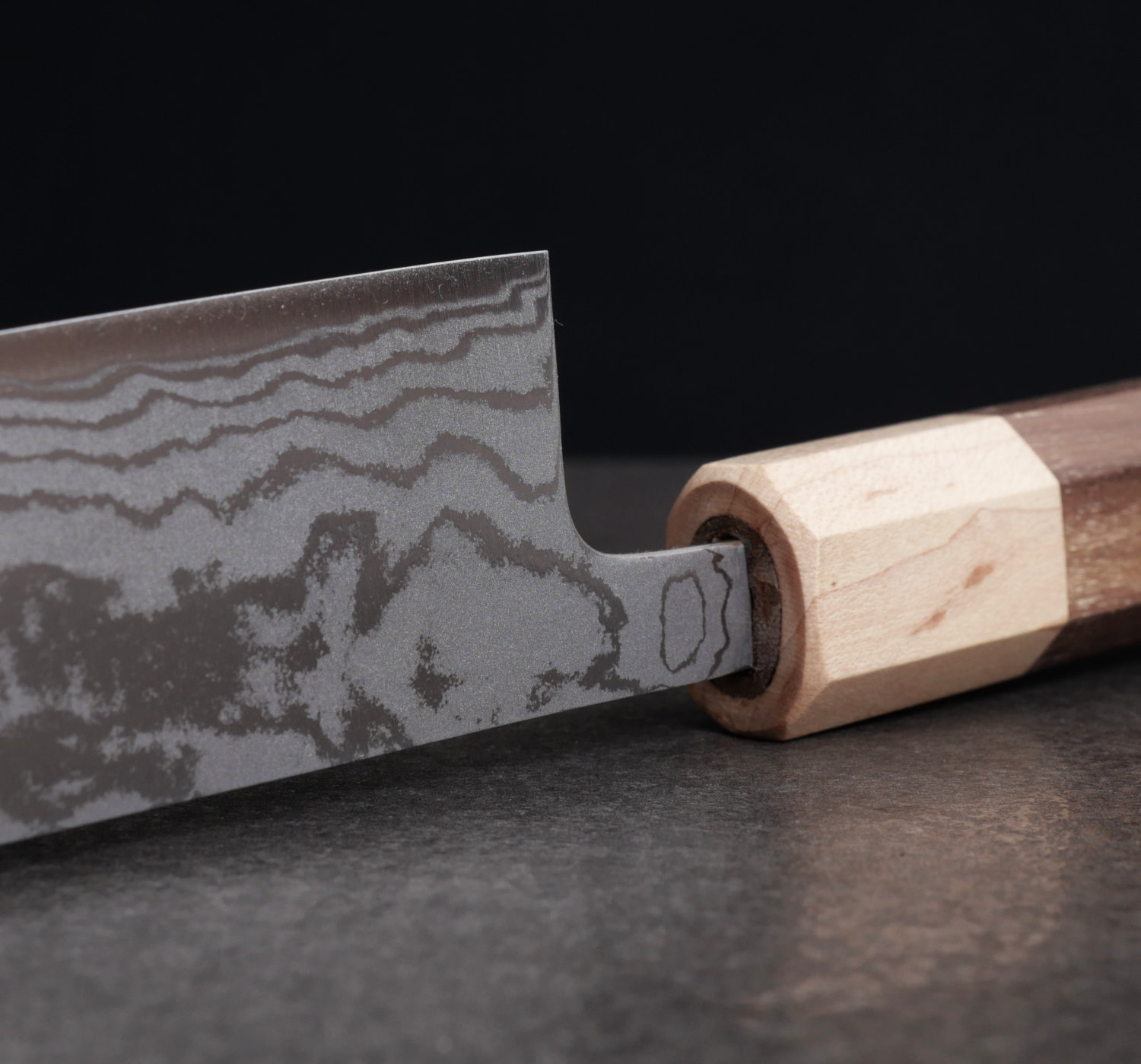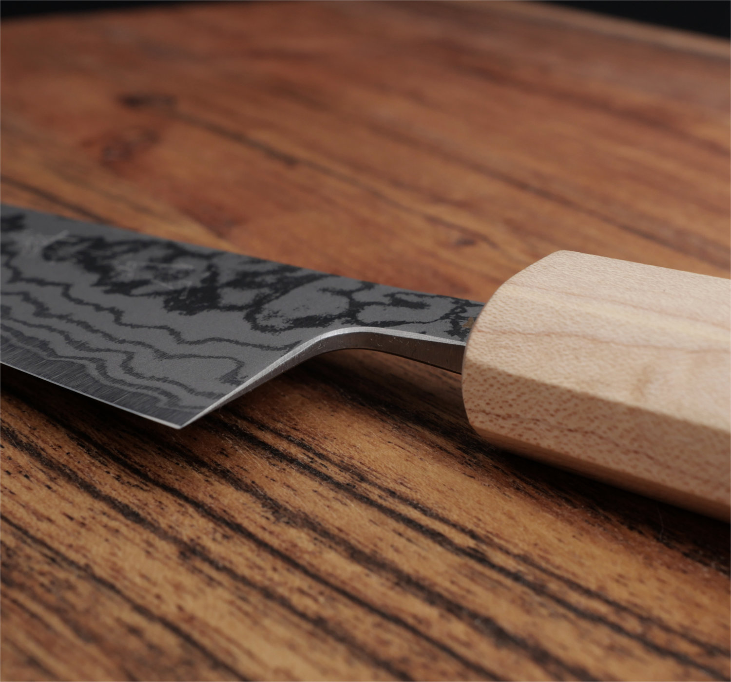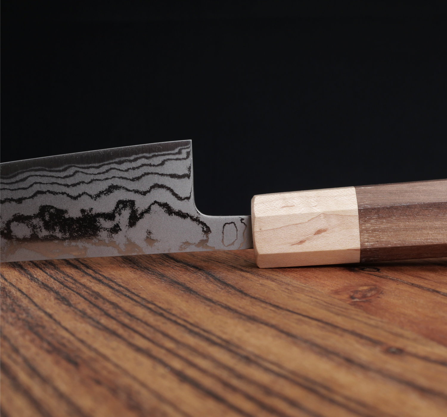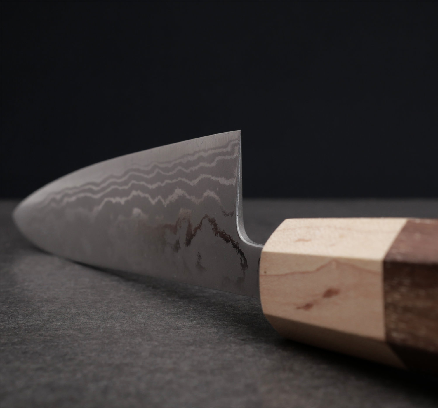 Bladet har en kärna av Aogami#2 kolstål (kallas även Blue#2) som härdats till 63-64 HRC. Kärnstålet har laminerats med 10 lager stål vilket skapar ett underbart vackert damaskus-mönster. Bladet tar en sylvass egg som är enkel att underhålla och som har helt underbara skäregenskaper.