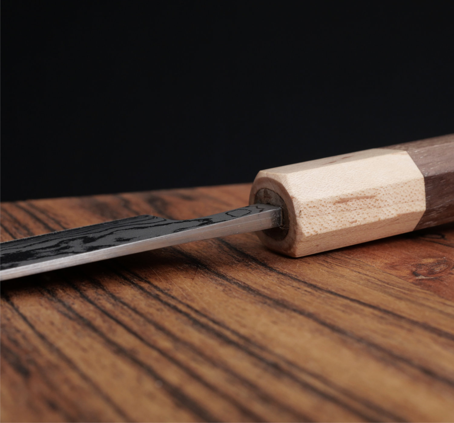 Allkniv med 14 cm långt blad i kolstålet aogami #2. Skaftet är åttakantigt och tillverkas av valnöt med ett bolster i ljus lönn.
