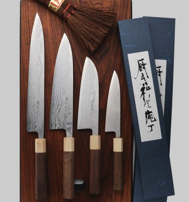 Kolstålet Aogami kommer med tiden att utveckla en vacker patina. Bladet bör torkas torrt efter varje användning för att undvika rostangrepp. Även om det alltid torkas torrt så kommer utseendet att påverkas av råvarorna som används. En vass kniv med stor personlighet.