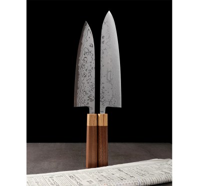 Kockkniv med 24,5 cm långt blad i kolstålet aogami #2. Skaftet är åttakantigt och tillverkas av valnöt med ett bolster i ljus ek.