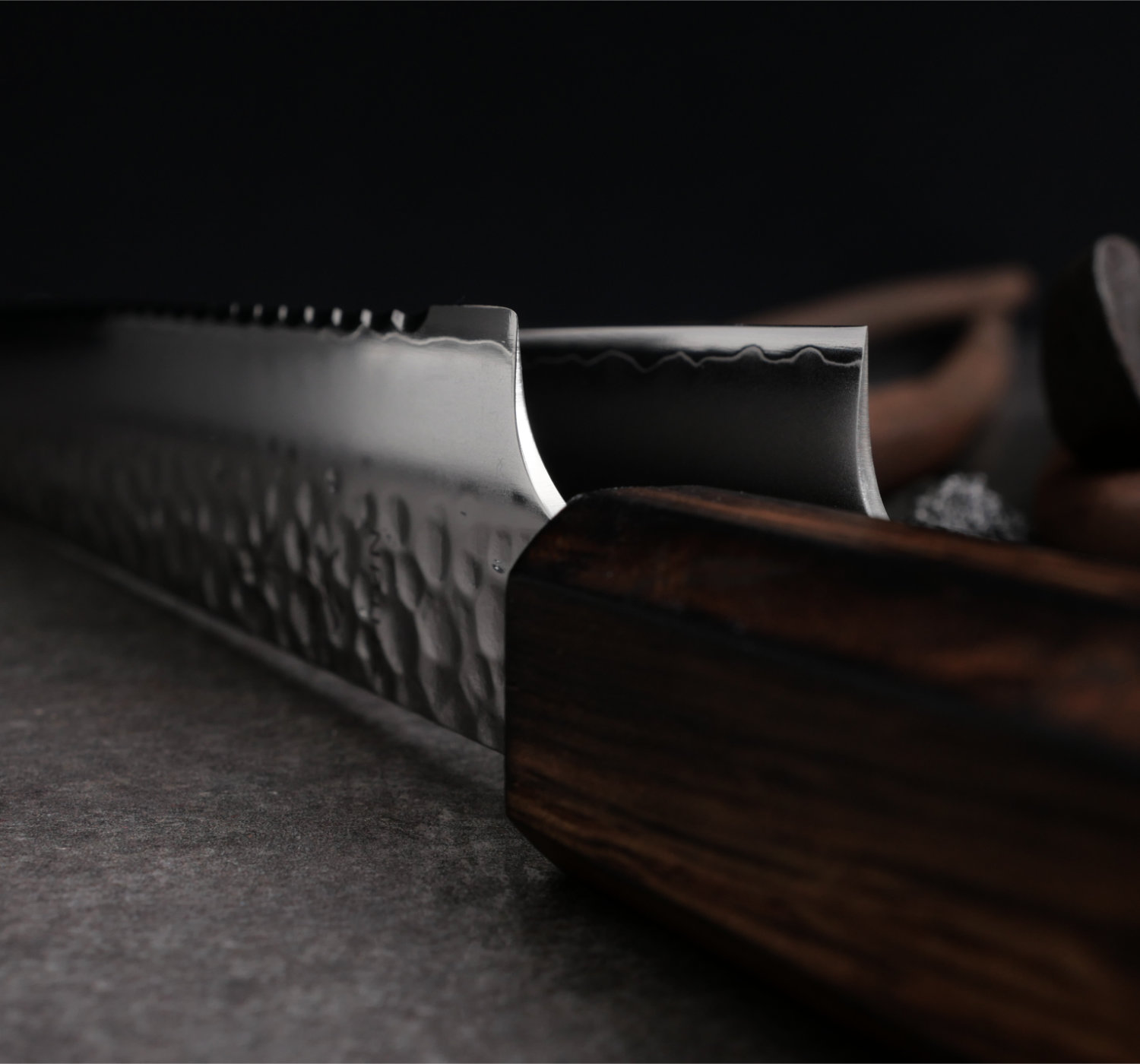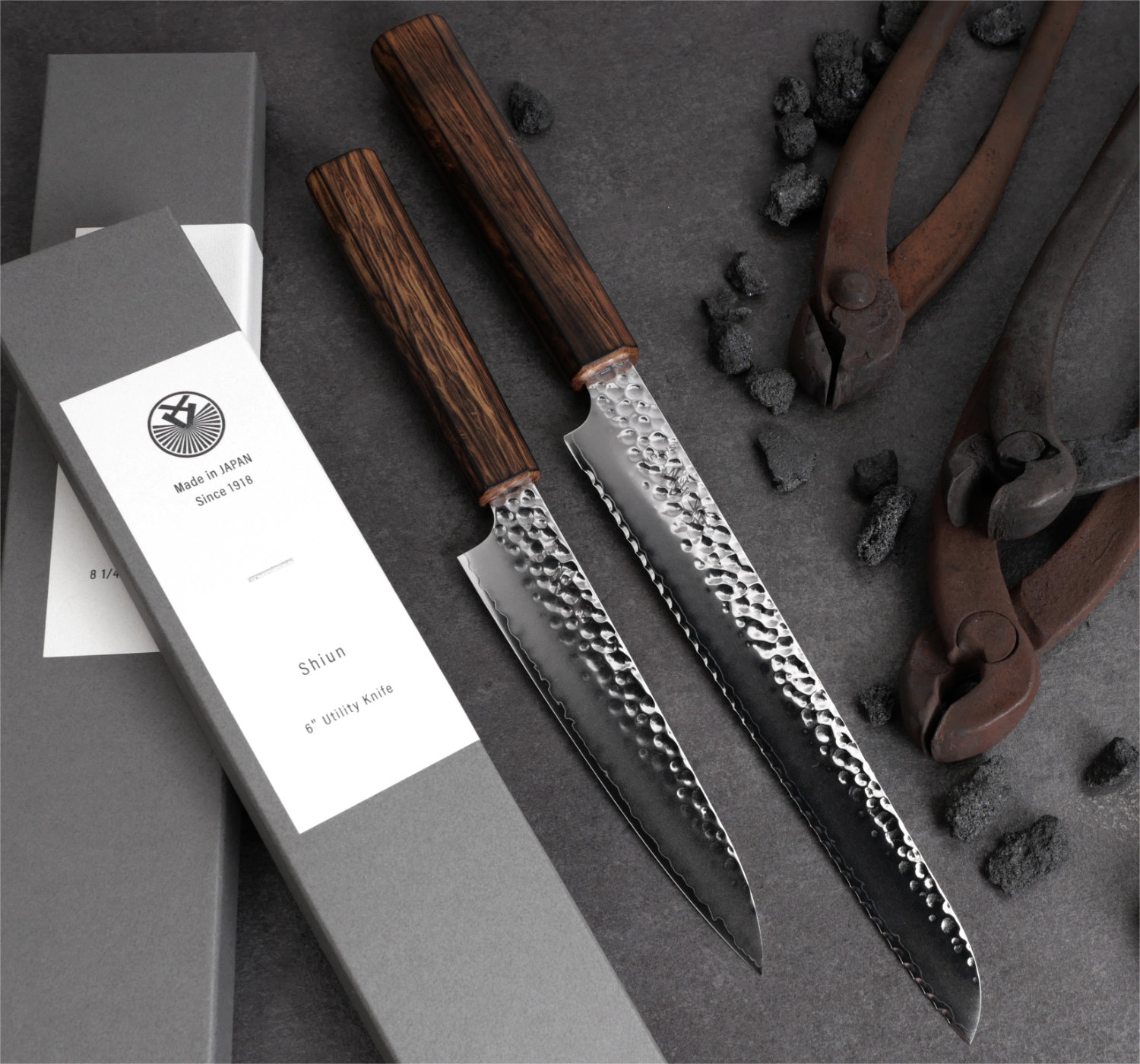 Shiun VG-10 är en otroligt prisvärd kniv i det hårda rostfria stålet VG-10. Bladet är tunt och fint, och kniven levereras med imponerande skärpa. Finishen på bladet kallas tsuchime, en hammarbankad textur som ger ett rustikt intryck. Detta förstärks av skaftet i mörkbetsad ek.