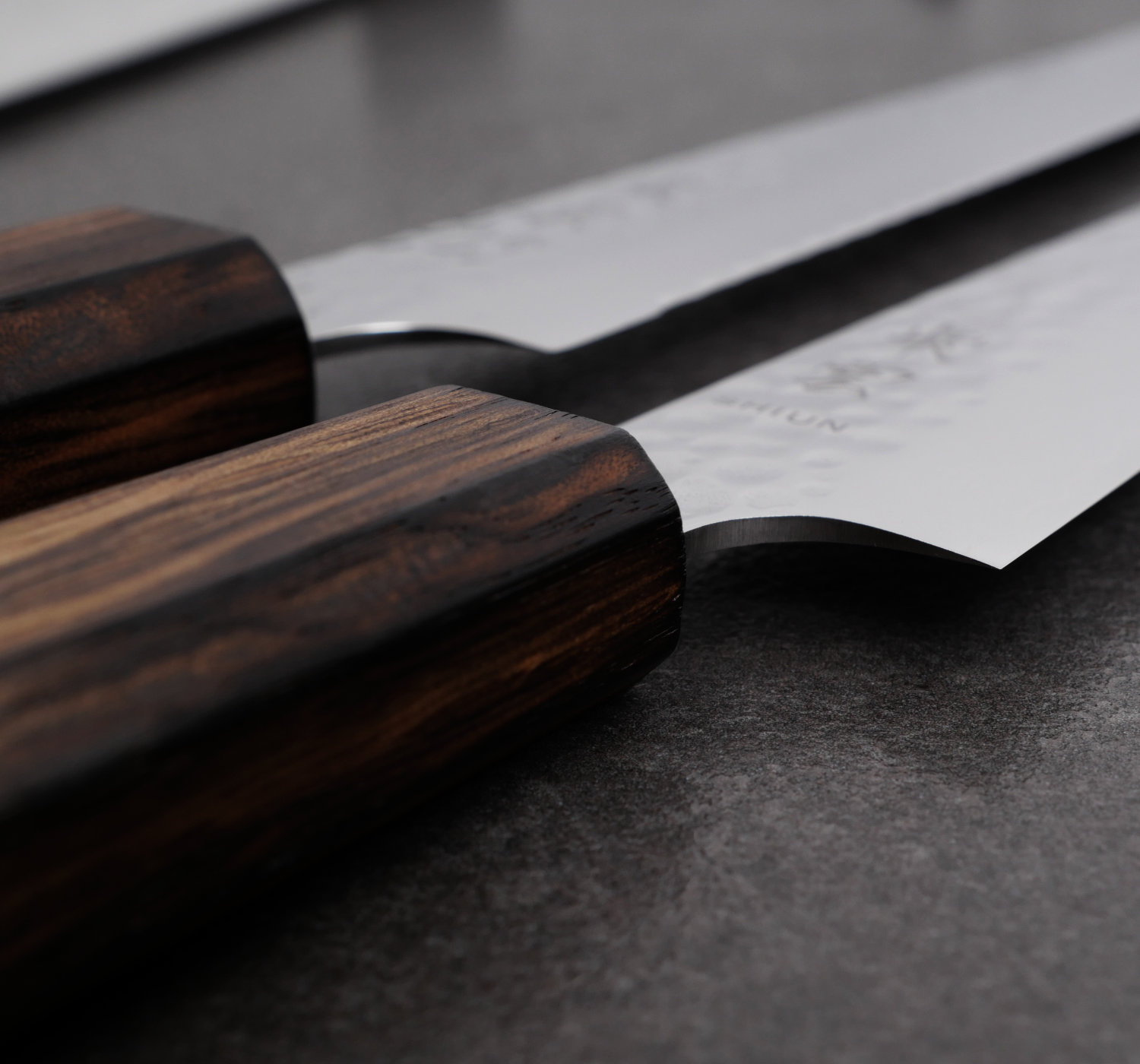 Shiun VG-10 är en otroligt prisvärd kniv i det hårda rostfria stålet VG-10. Bladet är tunt och fint, och kniven levereras med imponerande skärpa. Finishen på bladet kallas tsuchime, en hammarbankad textur som ger ett rustikt intryck. Detta förstärks av skaftet i mörkbetsad ek.