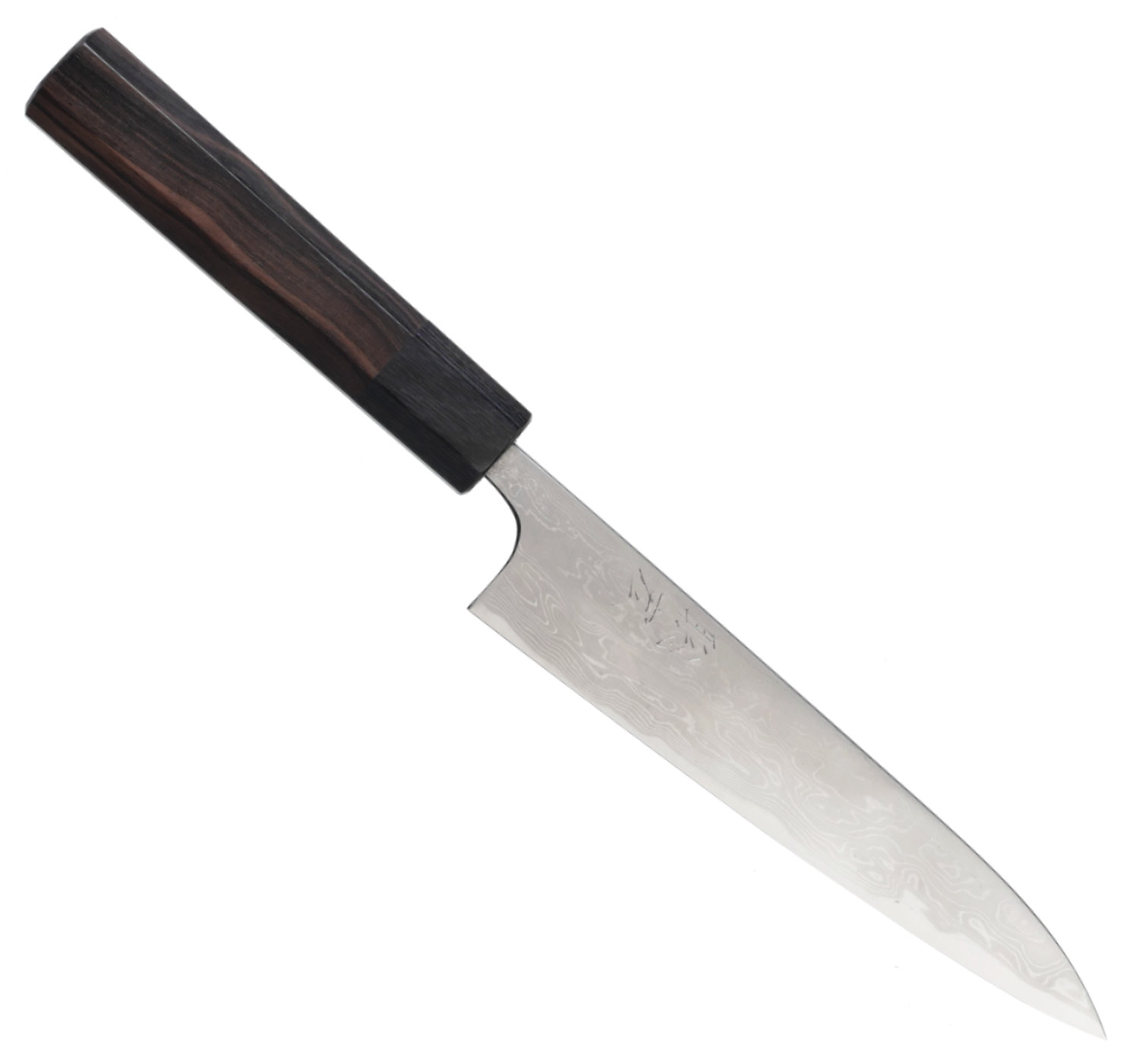 Wakui har rundat av alla kanter och gett bladet mjuka former. Han taperar bladen med stor skicklighet (avsmalning från rygg till spets) och kniven ligger därför väldigt bra i handen. Handtaget är åttakantig i ebenholts med bolster i pakkaträ.