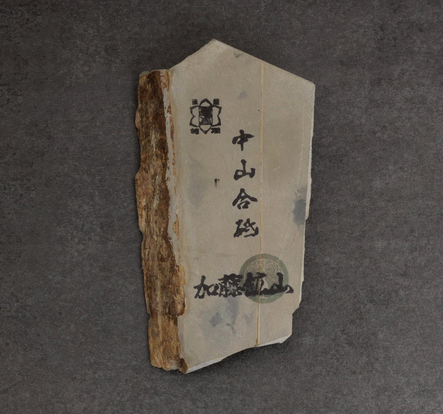 Nakayama natursten för kasumislipning. Den ger god kontrast mellan jigane och hagane, inte spegelblank utan mer nyanser av ljusgrått.