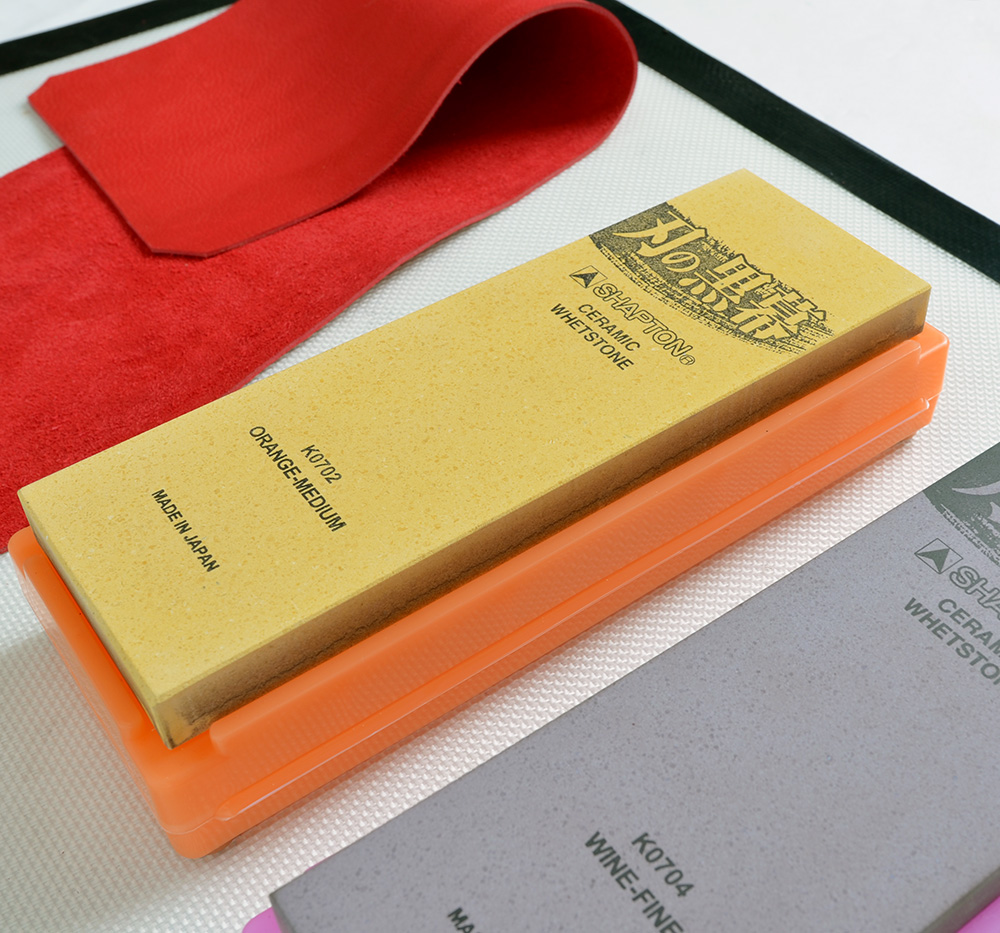1 st Slipsten medel med finhet #1000 från Shapton Professional. Den reparerar mindre hack i eggen och är grov nog att snabbt resa en råegg, något som snabbar på arbetet och gör slipningen rolig.