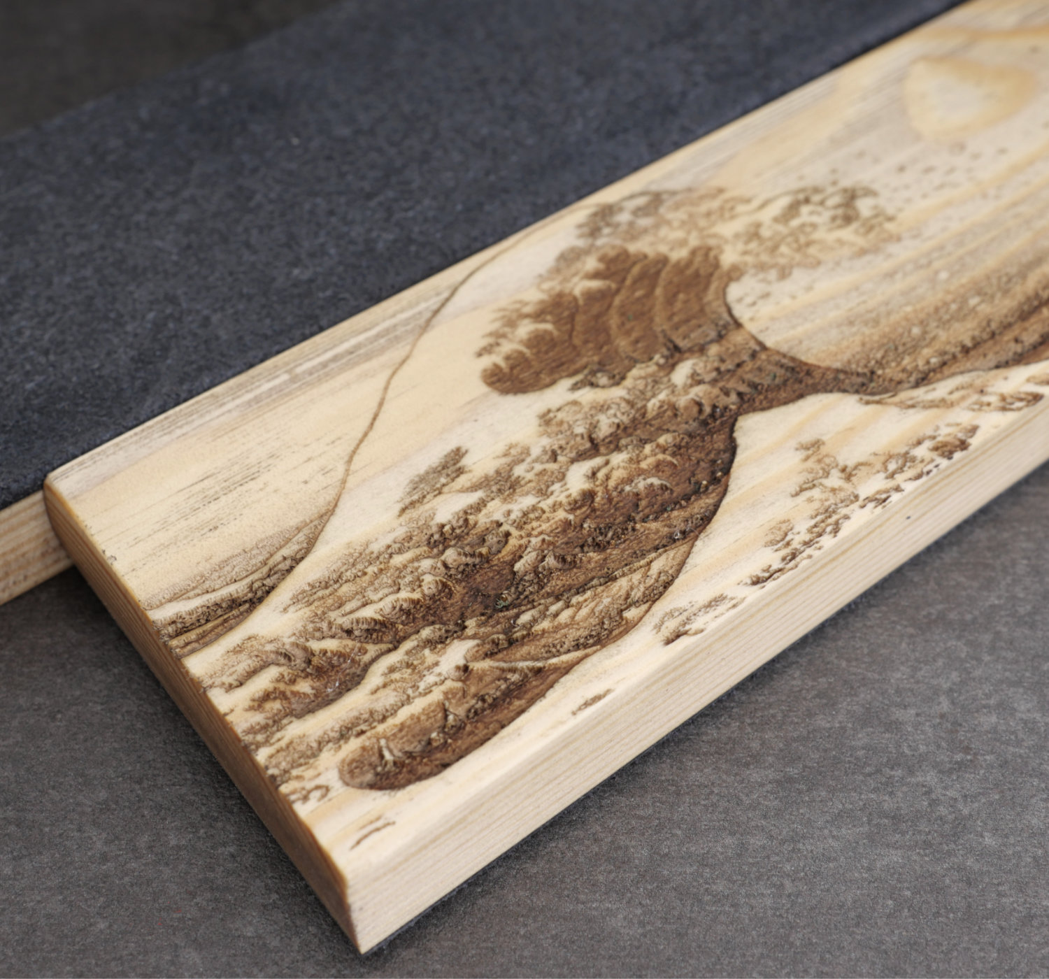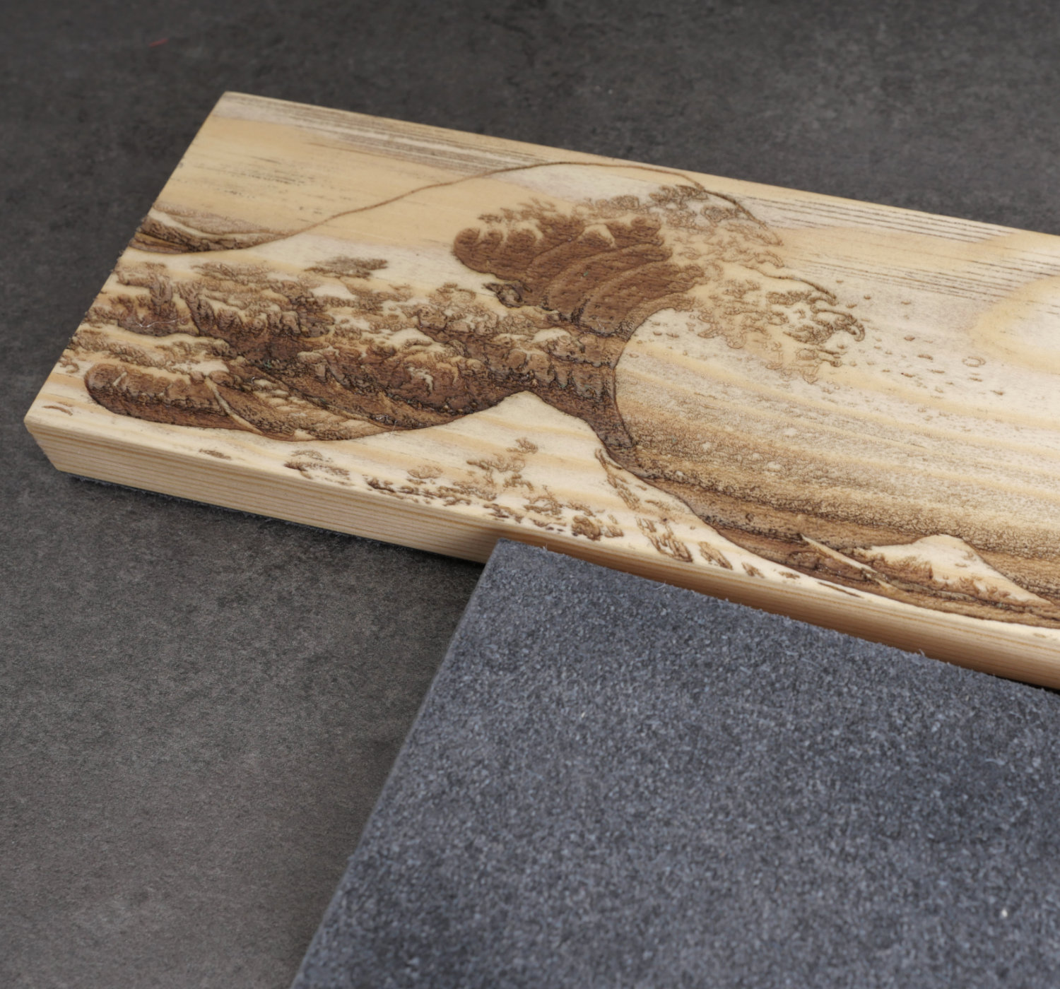 1 st Strigelblock med mörkblått skinn från Tärnsjö garveri, vegetabiliskt garvat för maximal effekt. Lädret är monterad på en träbas av svensk furu, vars undersida graverats med motivet av hokusai, den klassiska japanska vågen. Träbasen har behandlats med paraffinolja och bivax för både skydd och lyster.
