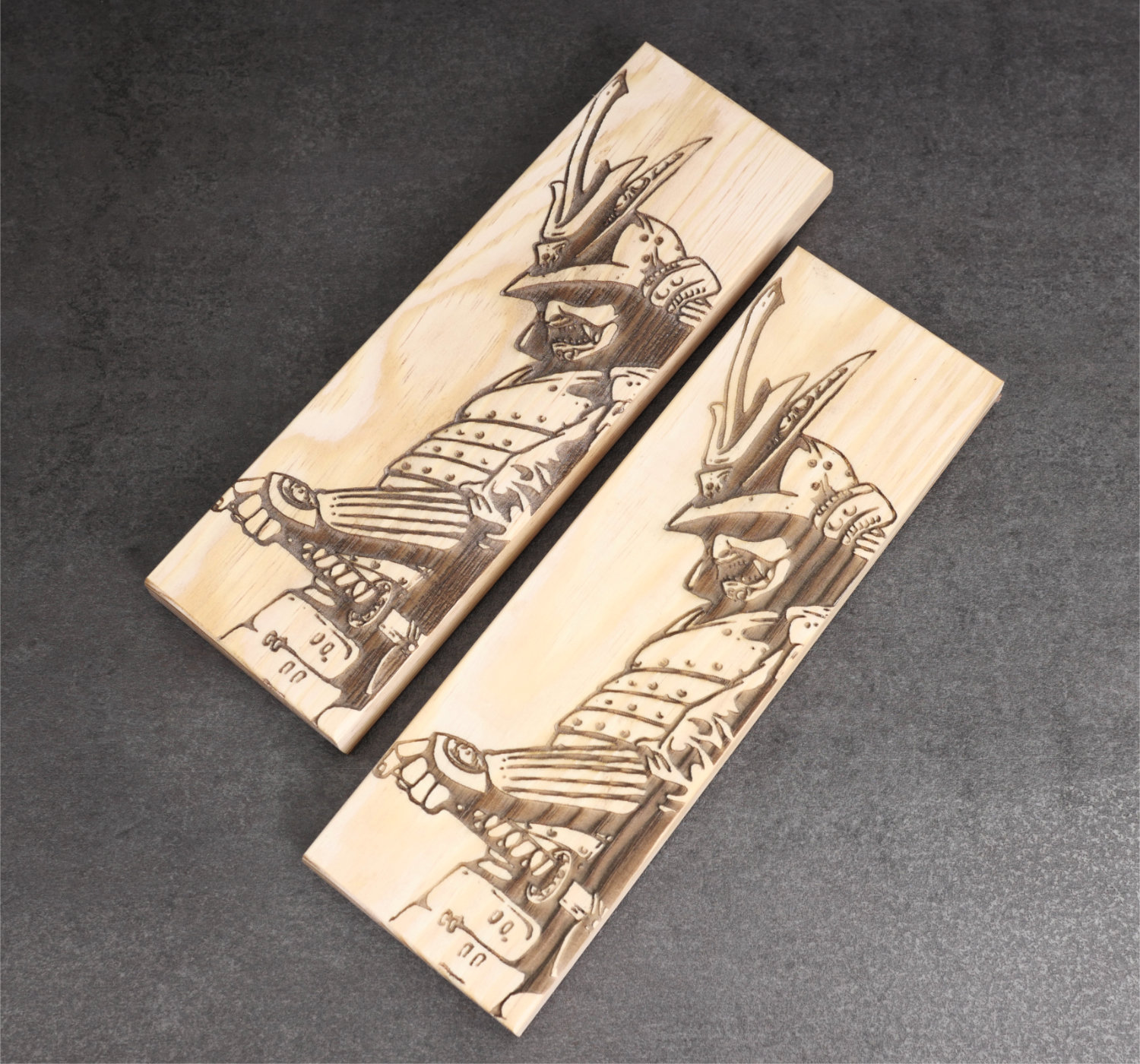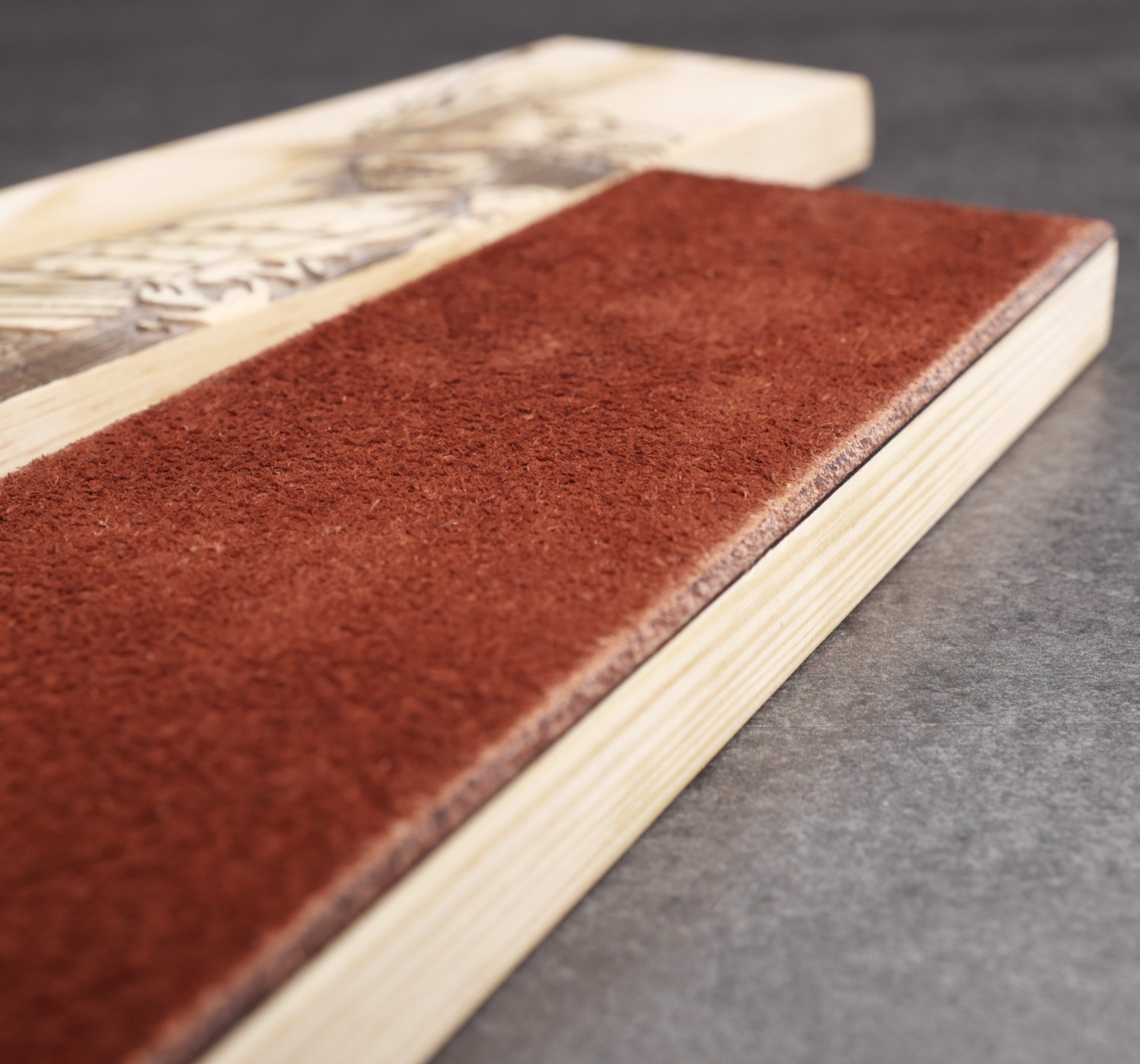 Strigelblock med burgundy-färgat skinn från Tärnsjö garveri, vegetabiliskt garvat för maximal slipeffekt. Lädret är monterad på en träbas av svensk furu, vars undersida graverats med motivet av en japansk samuraj. Träbasen har behandlats med paraffinolja och bivax för både skydd och lyster.