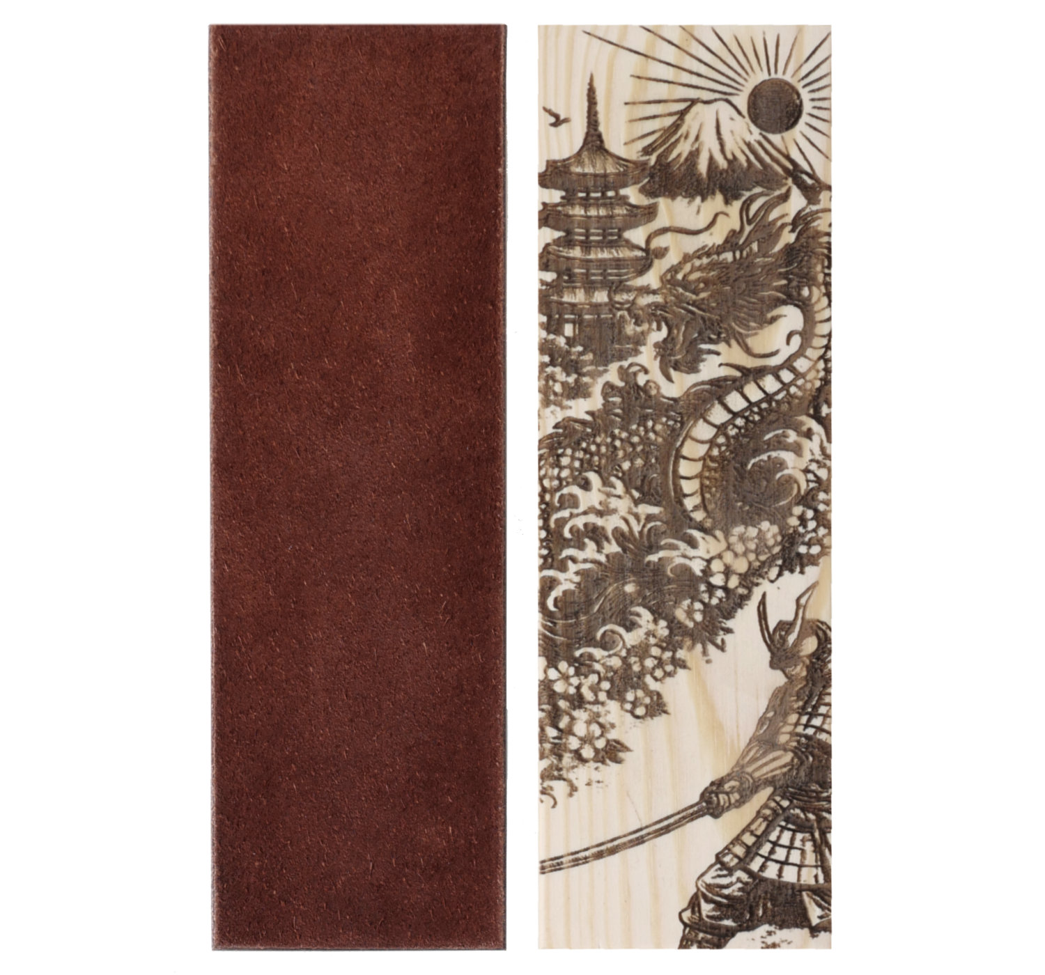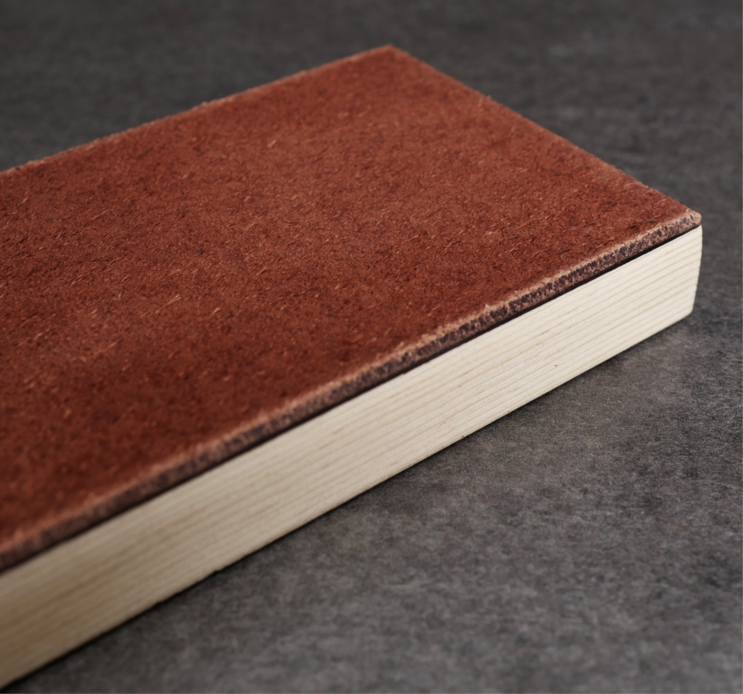 Strigel i rödbrunt skinn från Tärnsjö garveri, monterad på en träbas av svensk furu med lasergravyr.
