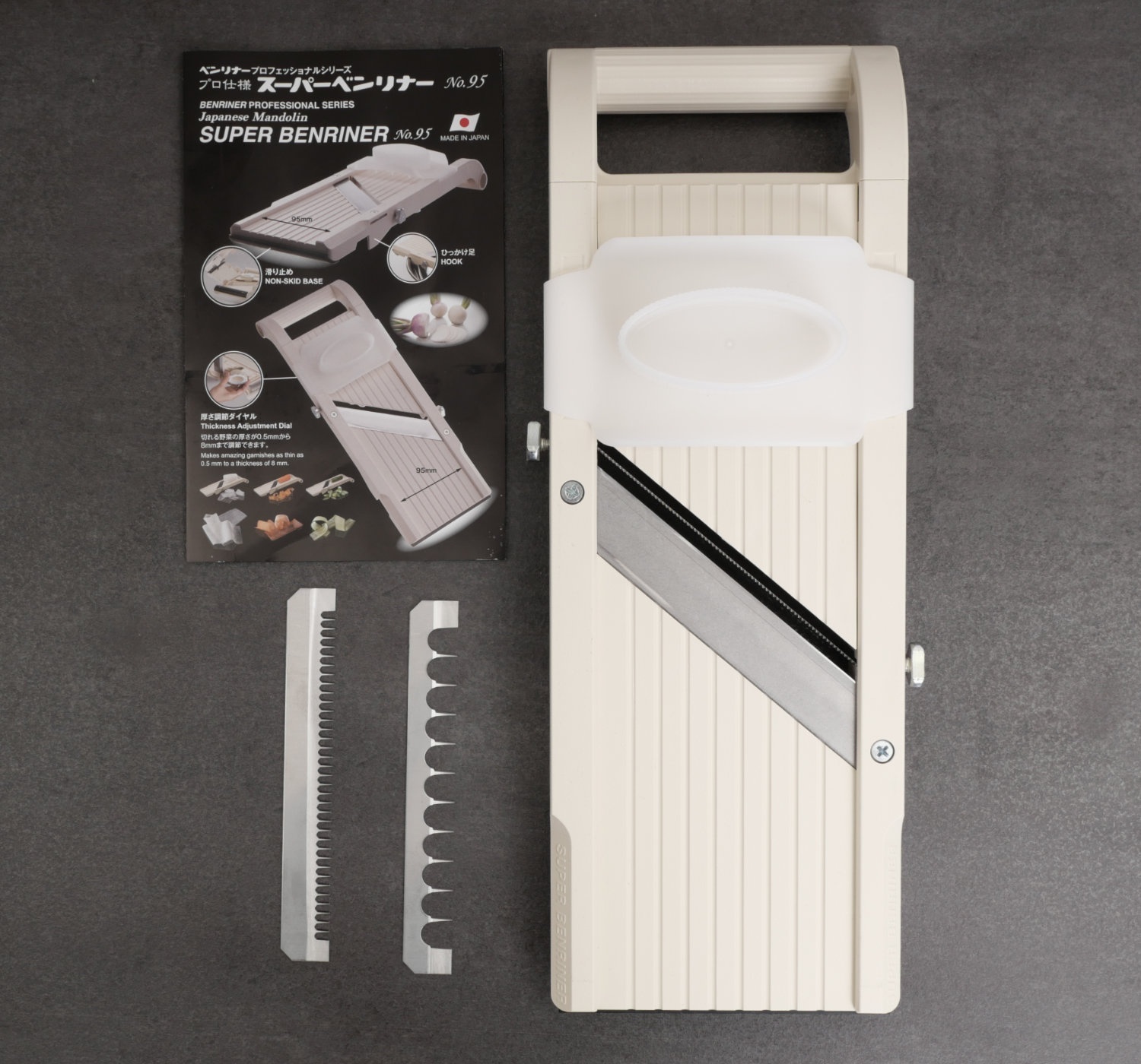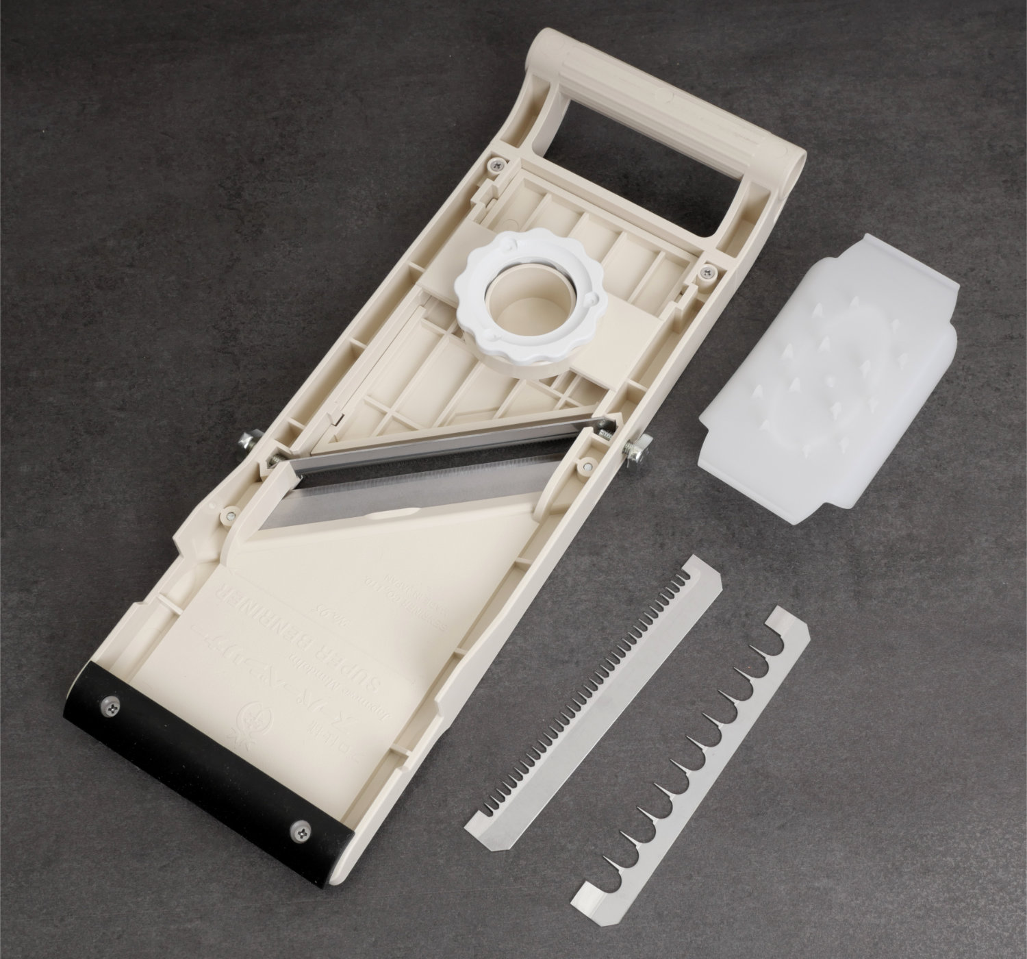 Mandolinen är enkel att ta isär för rengöring, och handdisk rekommenderas för att bevara skärpan.