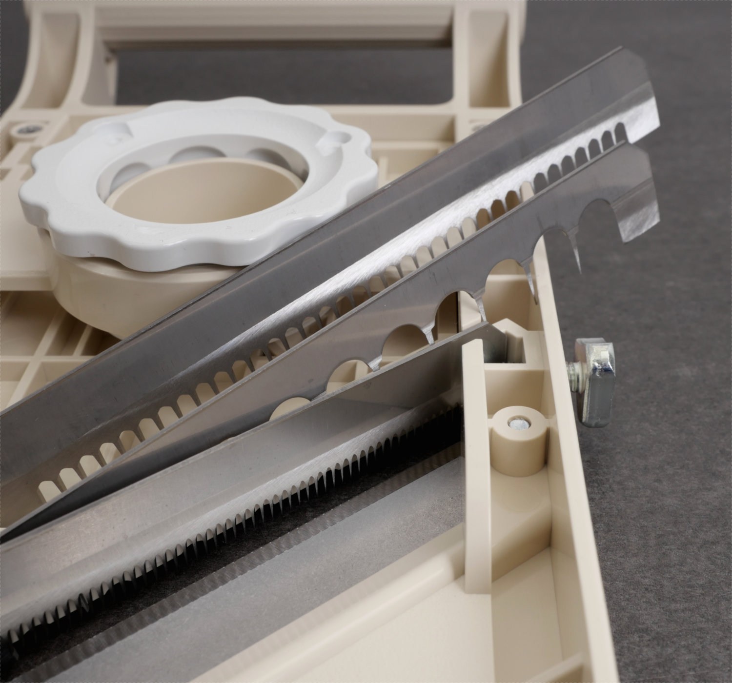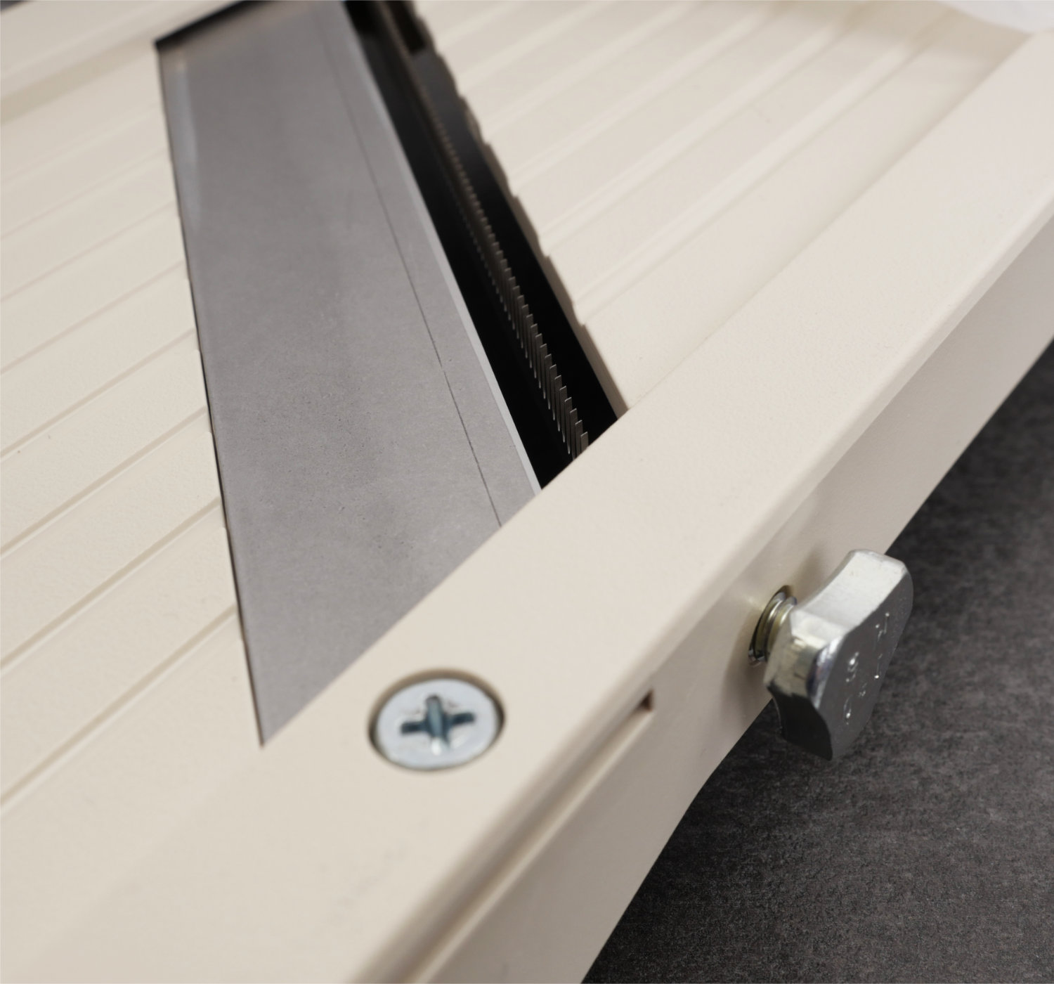 Det raka bladet har steglös inställning från 0,5 till 10 mm, vilket ger full kontroll över skivornas tjocklek. Bladet är handslipat och håller mycket hög skärpa för precisa och jämna snitt.