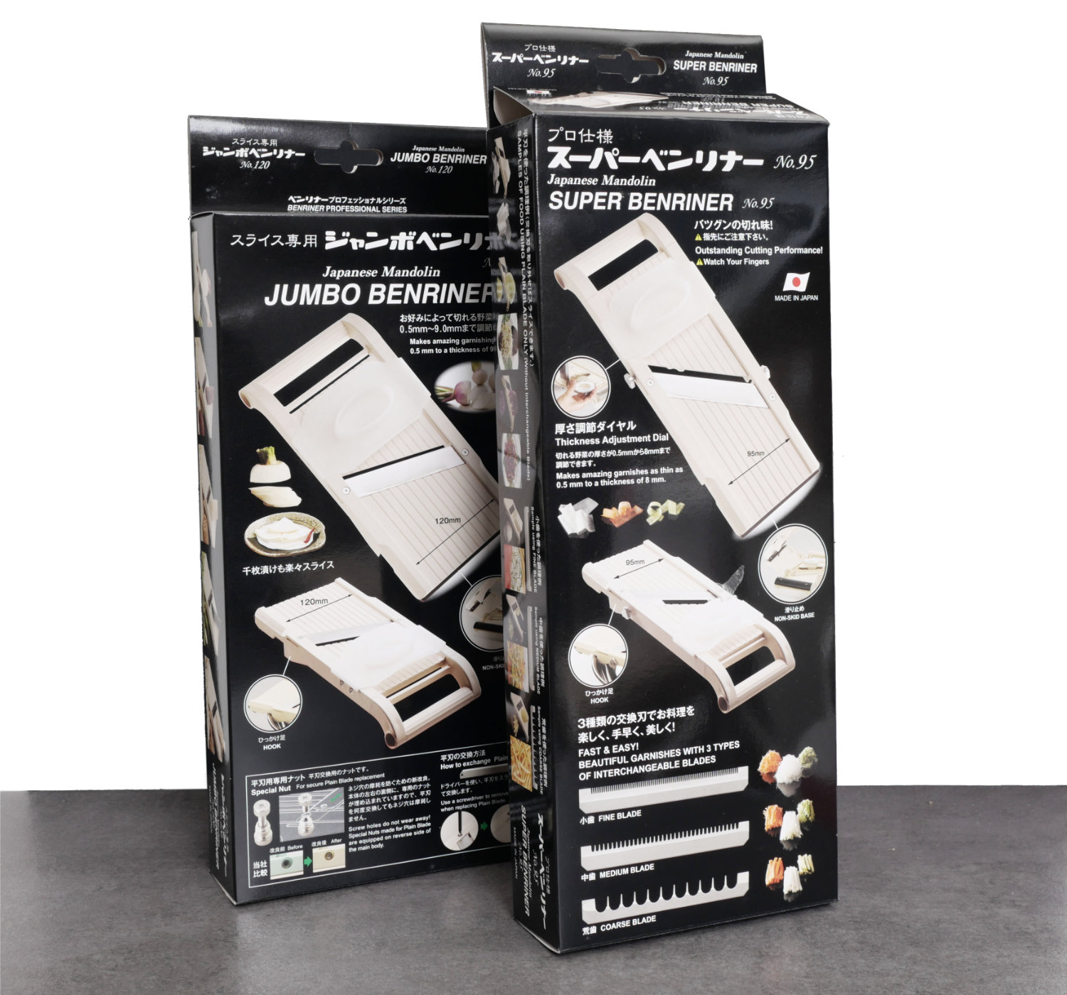 En professionell mandolin av högsta kvalitet för både skivning och strimling av grönsaker upp till 64 mm i bredd. Mandolinen levereras med ett rakt blad för skivning samt tre utbytbara julienneblad som strimlar i tre olika grovlekar.