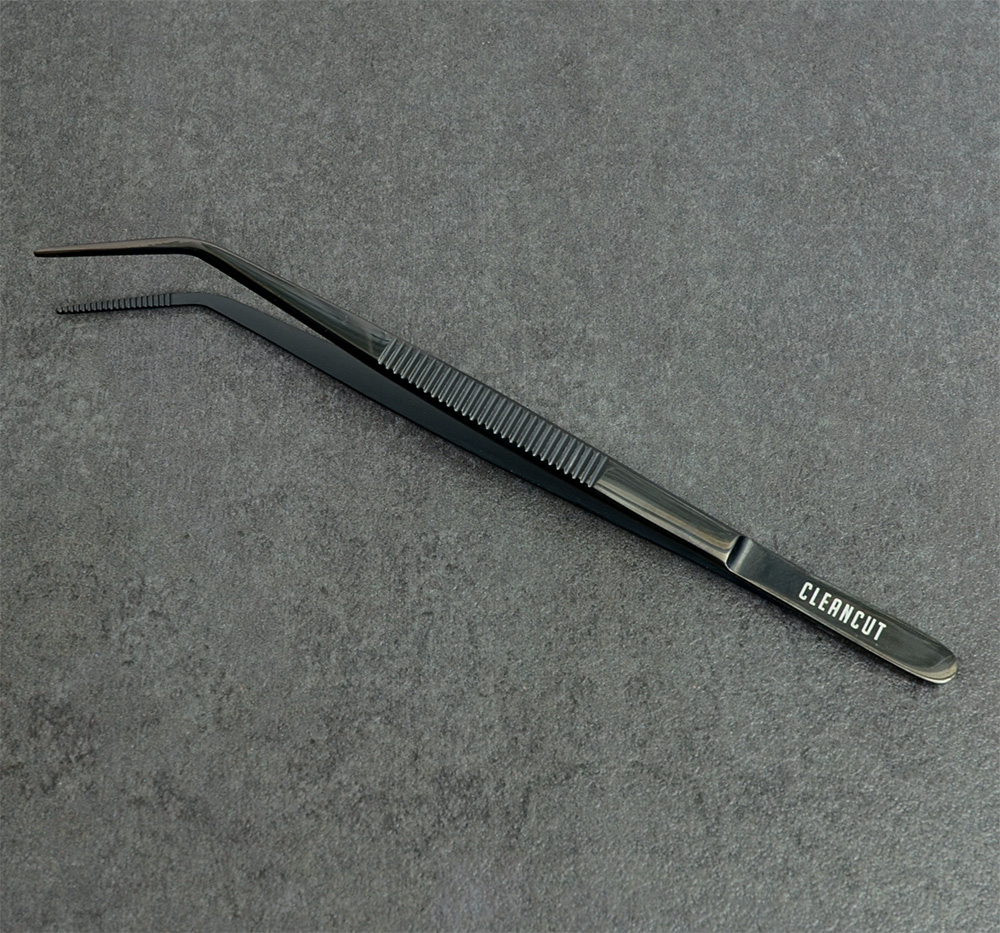 En extra finkalibrig pincett som mäter 14 cm. Pincetten är vinklad för att ge maximal fingertoppskänsla och den passar perfekt för pillrig uppläggning av mindre örtblad och annan garnityr. Huvudet är räfflat och stänger hela vägen.